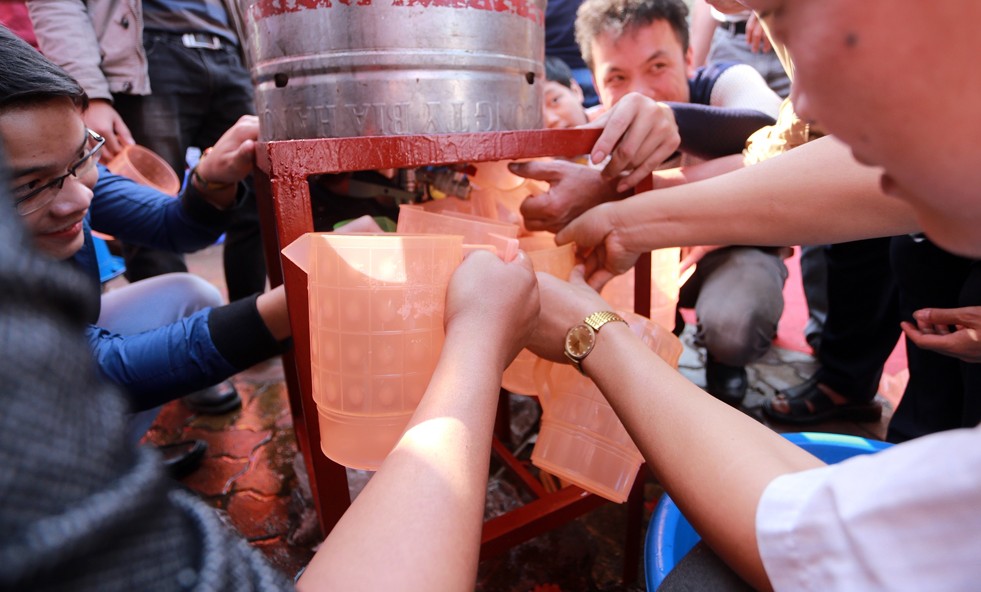 Người dân xếp hàng trật tự để được rót bia. Thời biết buổ trưa oi bức nên nhu cầu uống bia ngày càng cao.