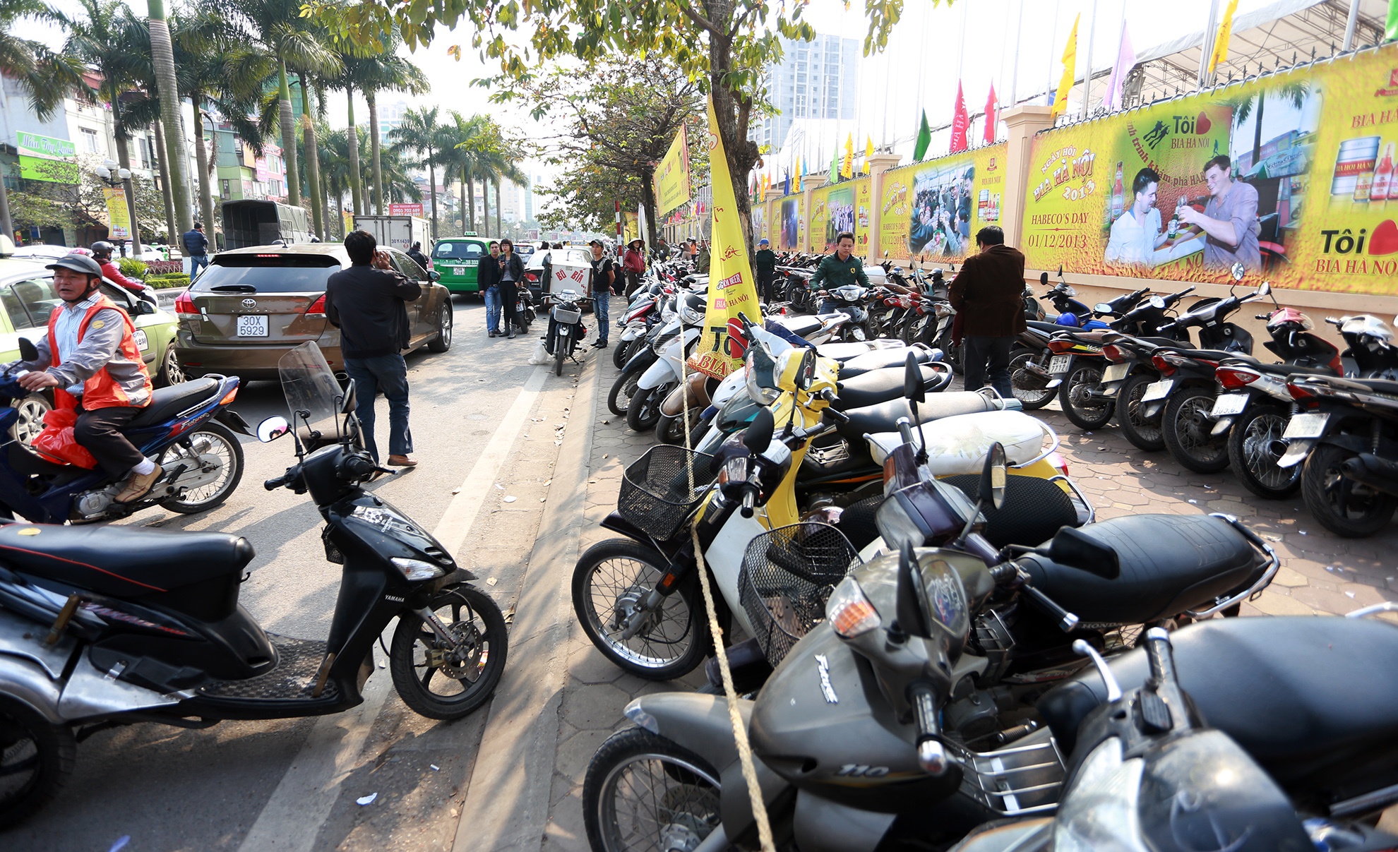 Các bãi đỗ xe phía ngoài không còn chỗ trống. Nhiều cửa hàng bên cạnh còn đóng cửa không bán hàng chỉ để trông xe với giá 20.000 đồng/xe máy.