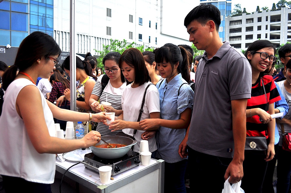 | Sau buổi khai mạc với phần thi tài giữa các đầu bếp Việt Nam - Hàn Quốc, khoảng 11h, các gian hàng ẩm thực Hàn bắt đầu bày bán sản phẩm. Từ lúc này, hầu như mọi gian hàng đều ken đặc người. Đây là cảnh các bạn trẻ vây kín gian hàng bán mì Hàn Quốc. |