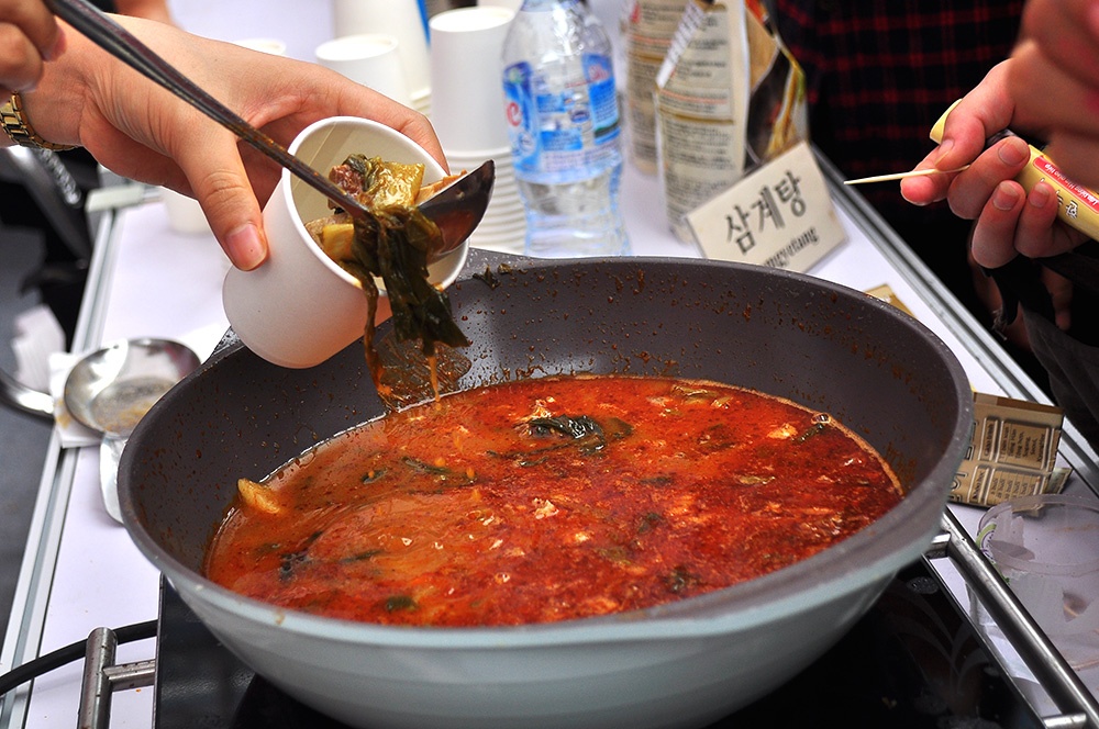 | Món canh kim chi truyền thống cũng được mọi người xếp hàng chờ thưởng thức. |