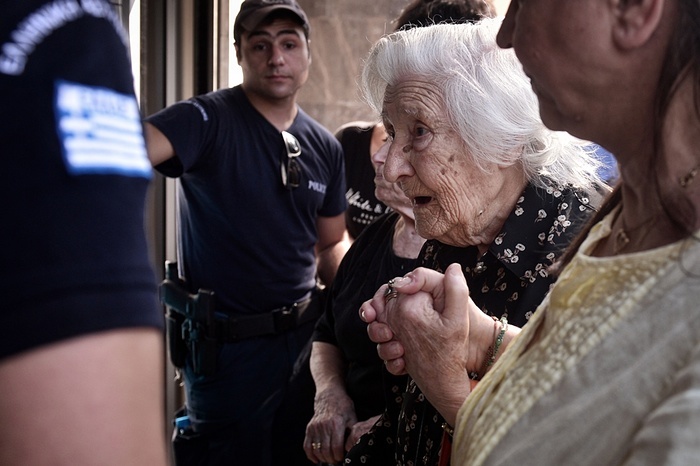 | Một người phụ nữ đưa mẹ già vào một ngân hàng ở Athens. |