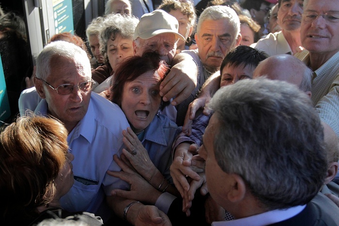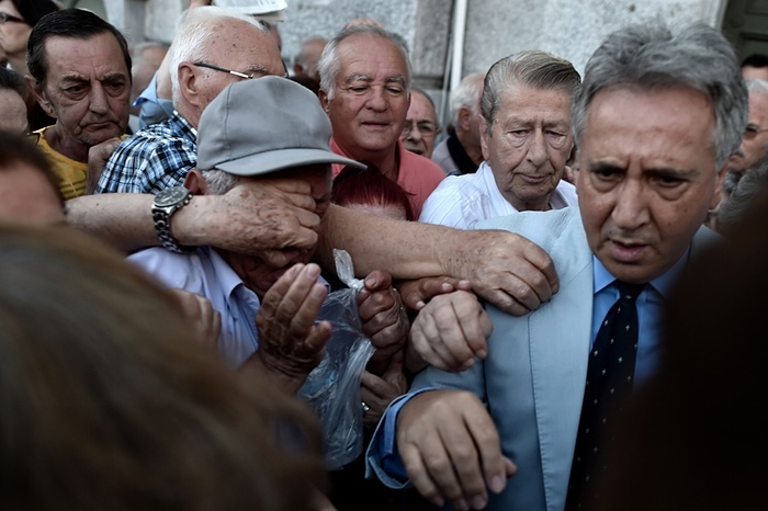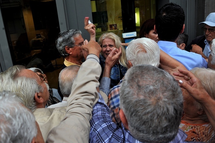 | Một quản lý nói chuyện với những người về hưu phía bên ngoài ngân hàng Alpha, Athens. |