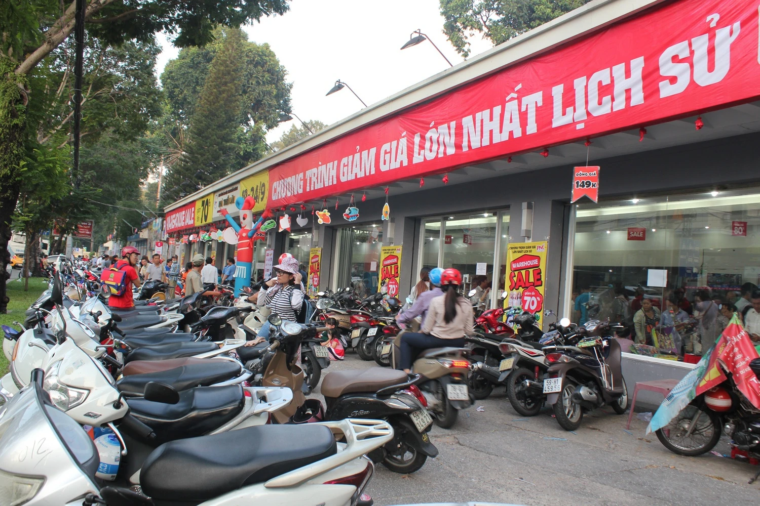 Giảm giá 70%, bán xe 1.000 đồng, cửa hàng bán đồ chơi trẻ em trên đường Nguyễn Thị Minh Khai, quận 1, TP HCM hai ngày qua thu hút rất đông phụ huynh xếp hàng chờ mua.