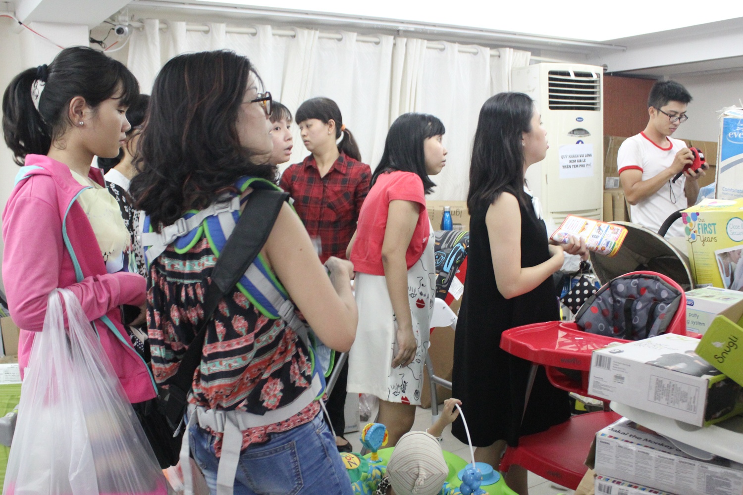 Bán chạy nhất là bình sữa, đồ chơi cho trẻ dưới 3 tuổi. Chị Linh, ở quận Bình Thạnh, cho biết, quá nhiều người chen mua nên chật vật lắm chị mới chọn được đồ.
