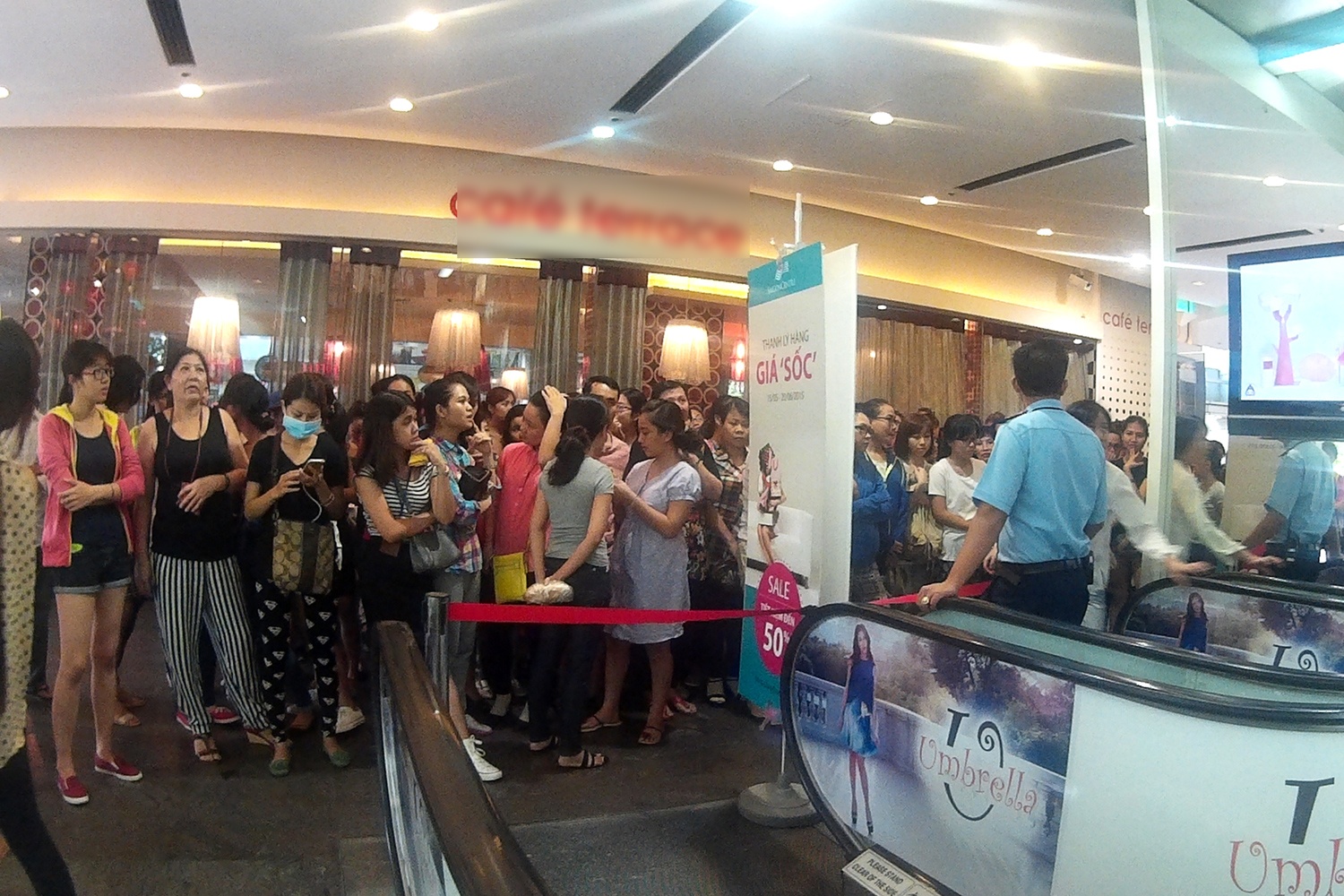 | Đám đông vây kín trước cửa hàng thời trang. Ai cũng muốn vào trước để có thể chọn được sản phẩm ưng ý. Phải mất thêm 30 phút, nhân viên bảo vệ mới ổn định được trật tự. |