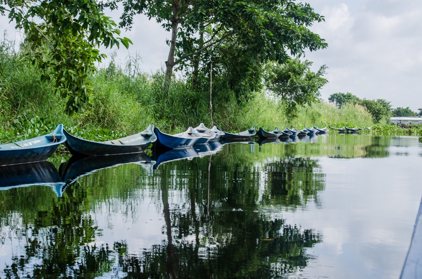 | Đây là khu rừng đặc biệt, rừng ngập nước nên du khách tham quan bằng thuyền chứ không phải đi trên đất như những khu rừng khác. Trong hình là những chiếc xuồng được cột dọc 2 bên bờ. |