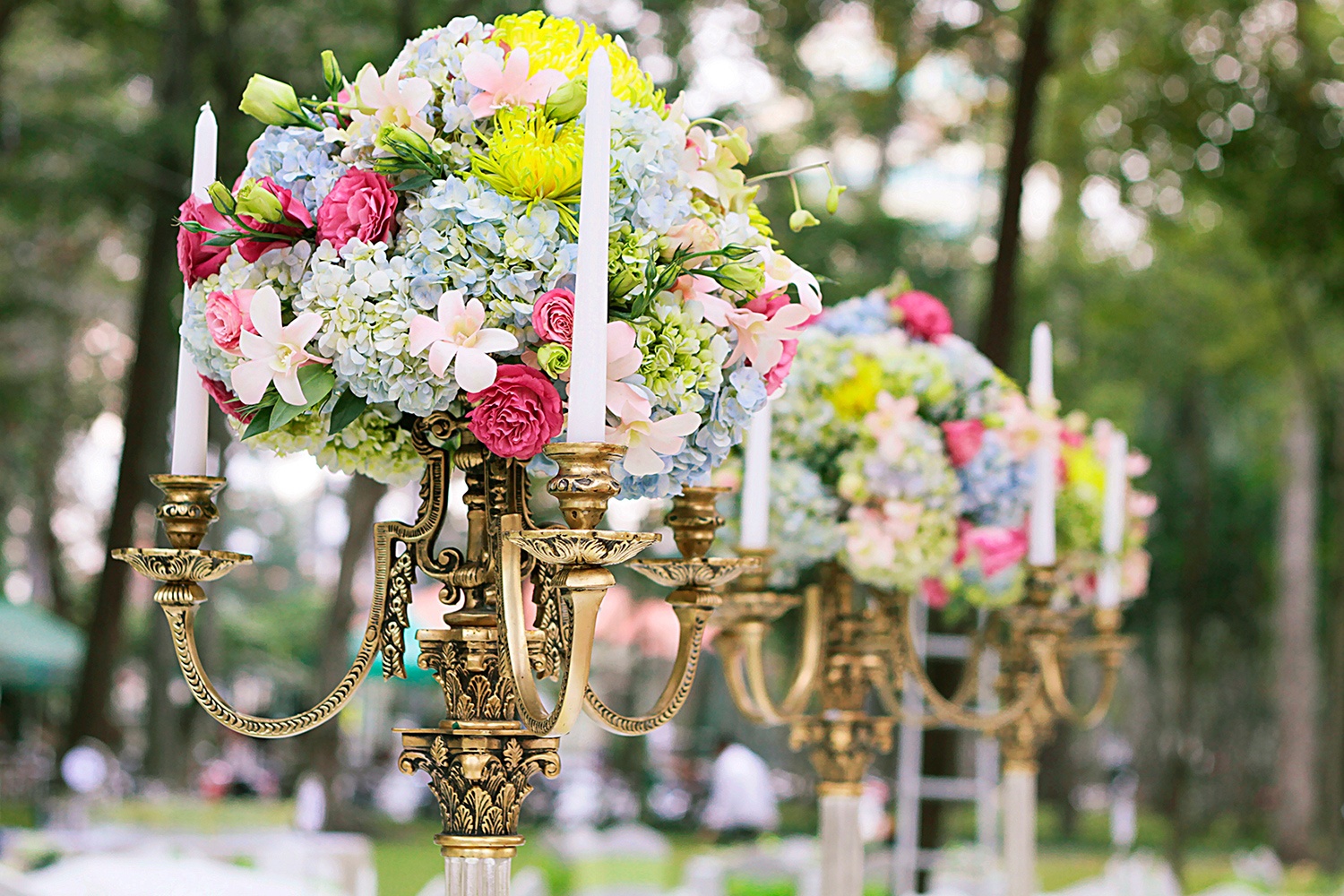 | Lễ đường được dựng dưới tán cây xanh, thảm đỏ được trải trên bãi cỏ, tạo nên một không gian lãng mạn. Phải mất đến 6 tiếng đồng hồ để thực hiện việc trang trí cũng như sắp xếp bàn ghế cho một tiệc cưới loại này. |