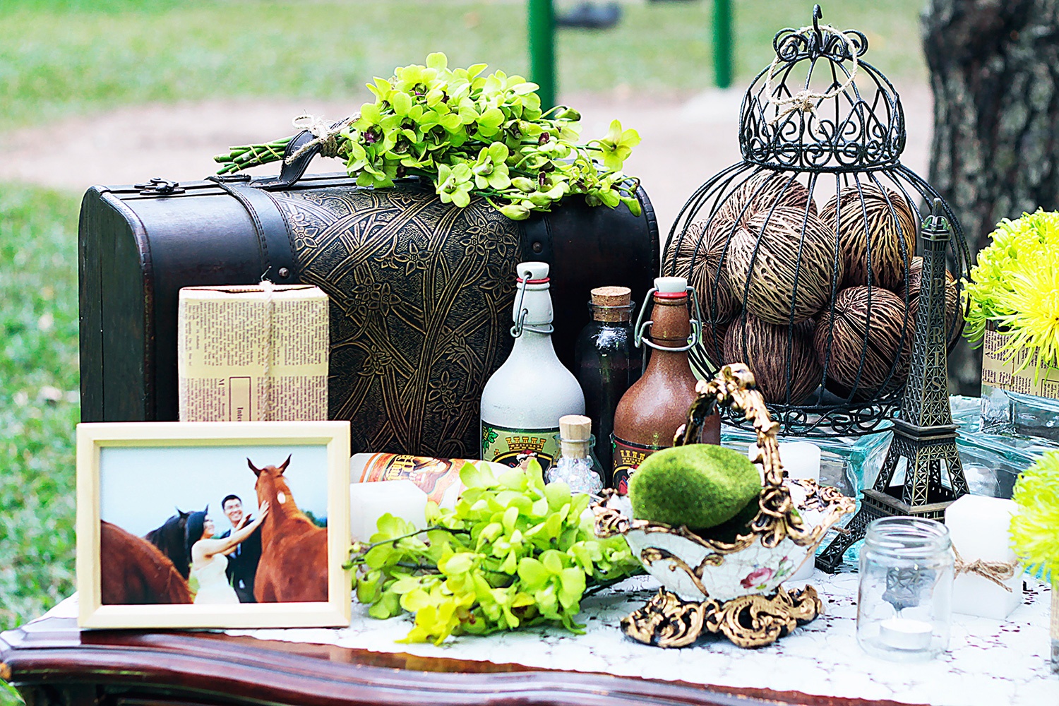 | Bàn lưu niệm được trang trí nghệ thuật với nhiều vật dụng theo phong cách châu Âu cổ điển.