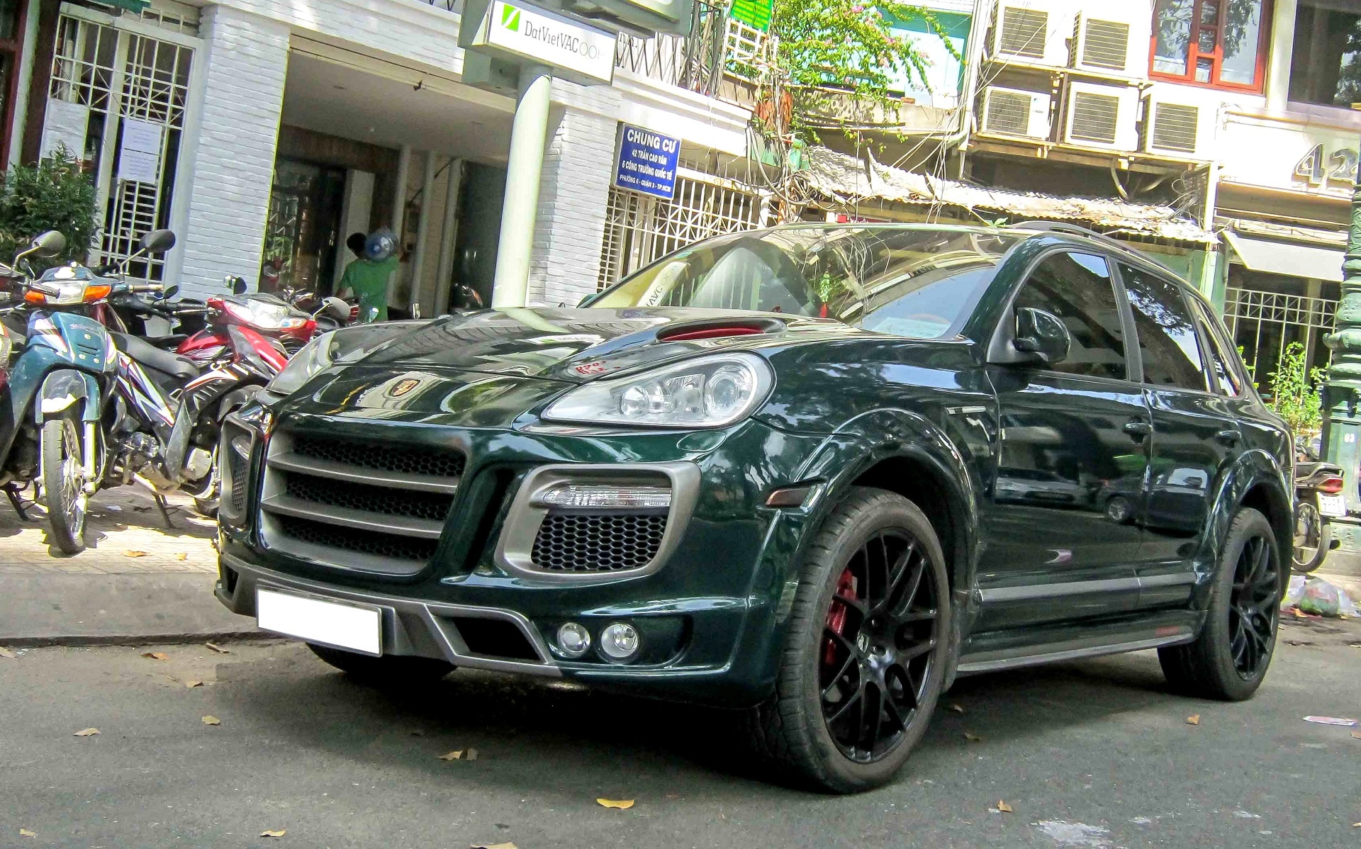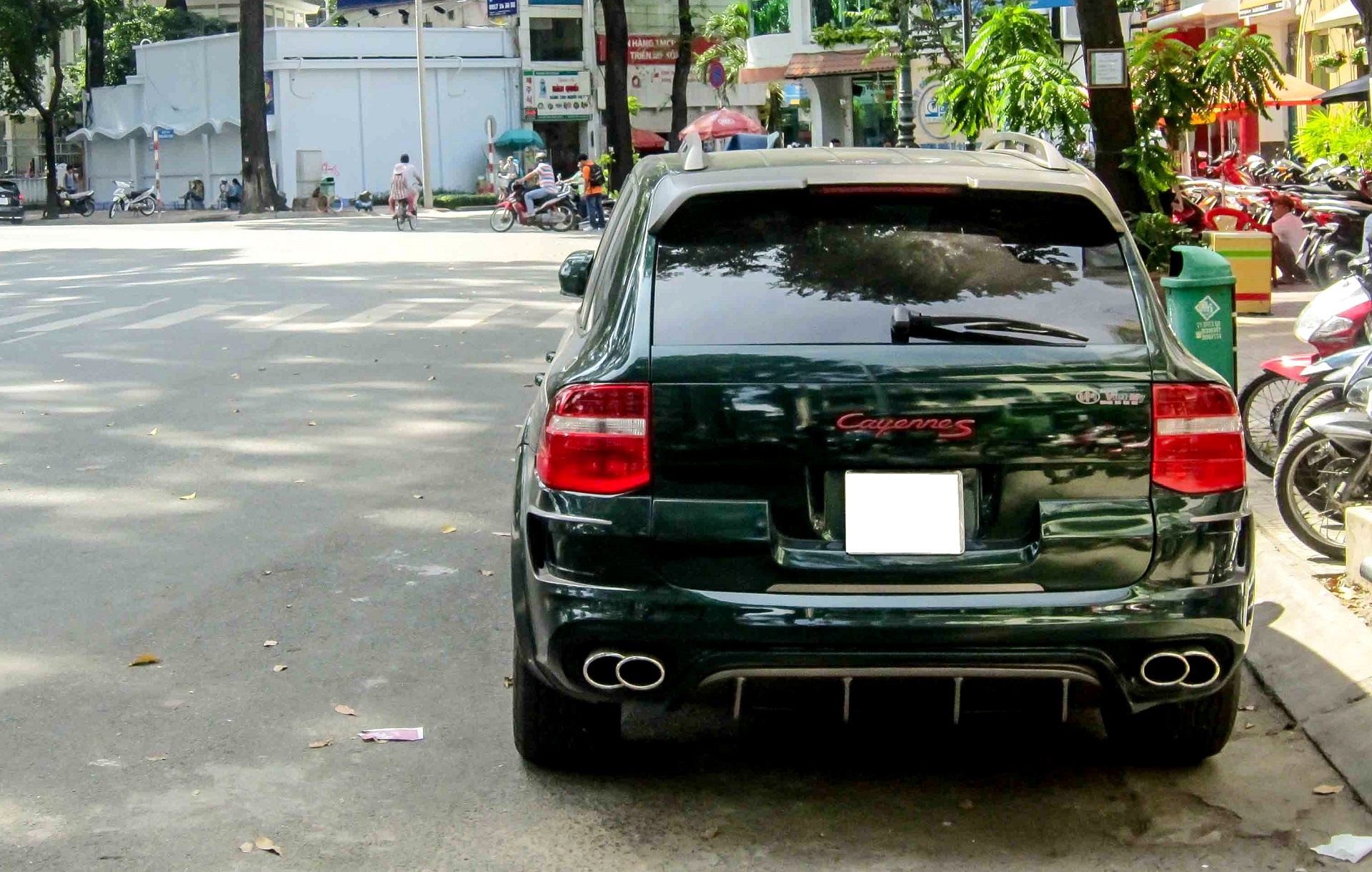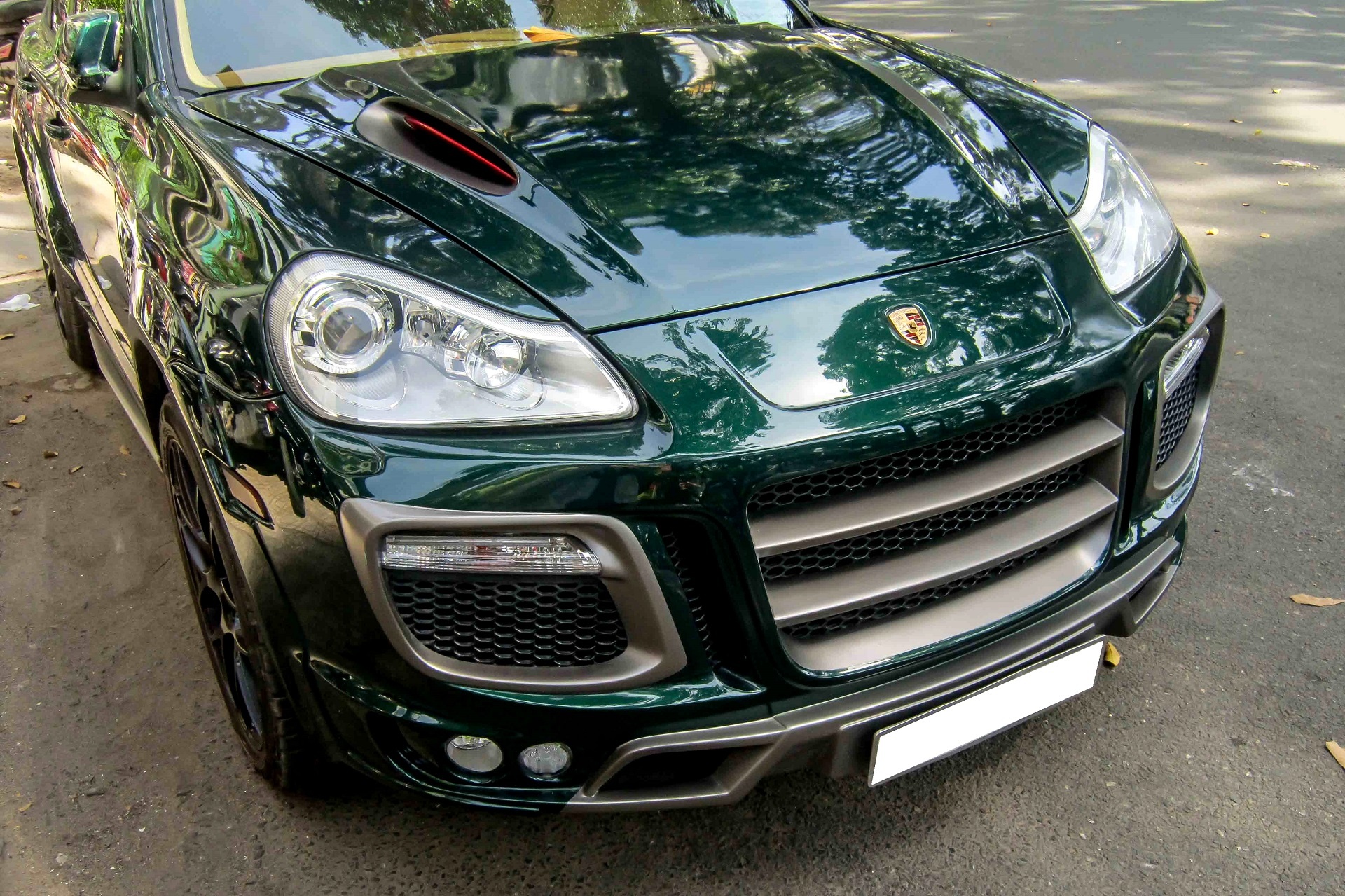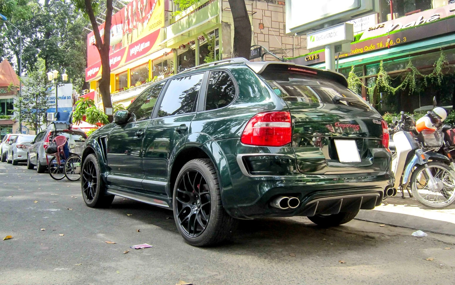 | Chiếc Porsche Cayenne S màu xanh vỏ dưa này hiện đang định cư tại Sài Gòn. Khác với những mẫu SUV truyền thống của hãng xe sang đến từ Đức, chiếc Cayenne S này trông khá hầm hố nhờ bộ body kit nhập từ Đức. |