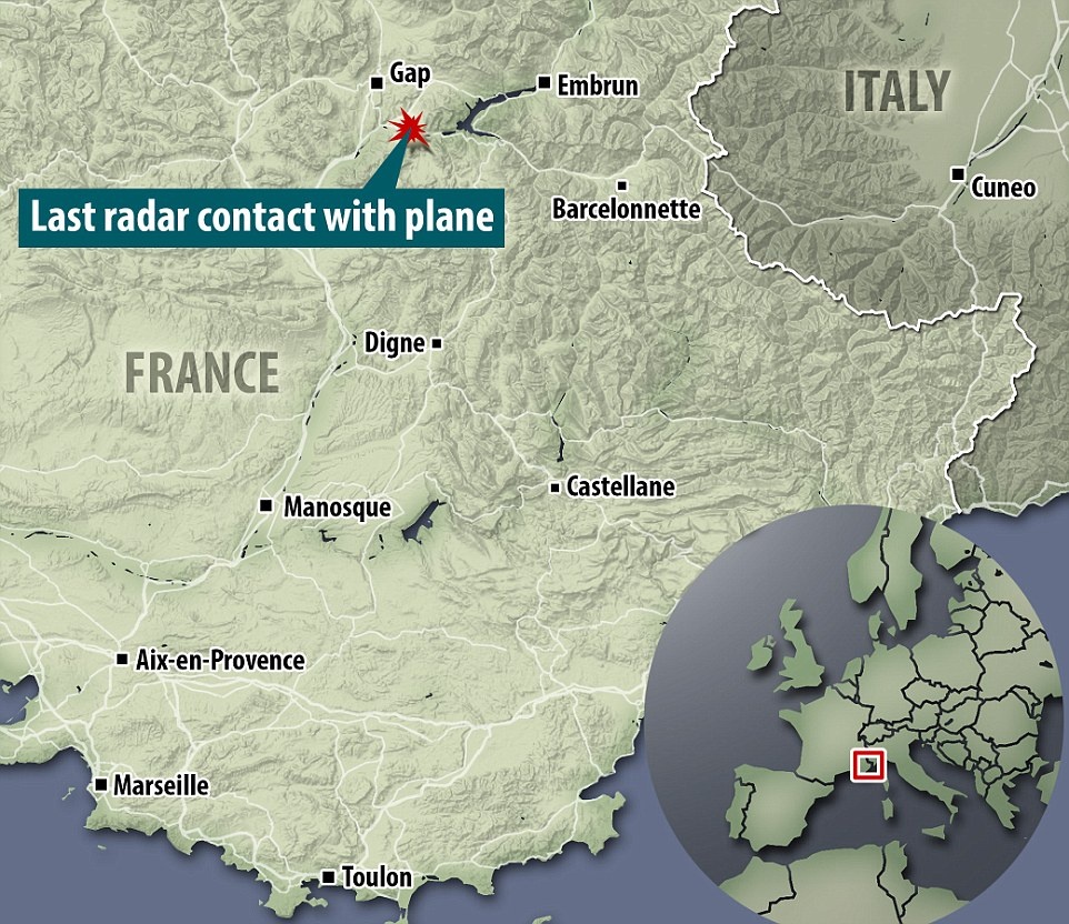 Vị trí radar phát hiện 4U9525 lần cuối cùng. Ảnh: Daily Mail |