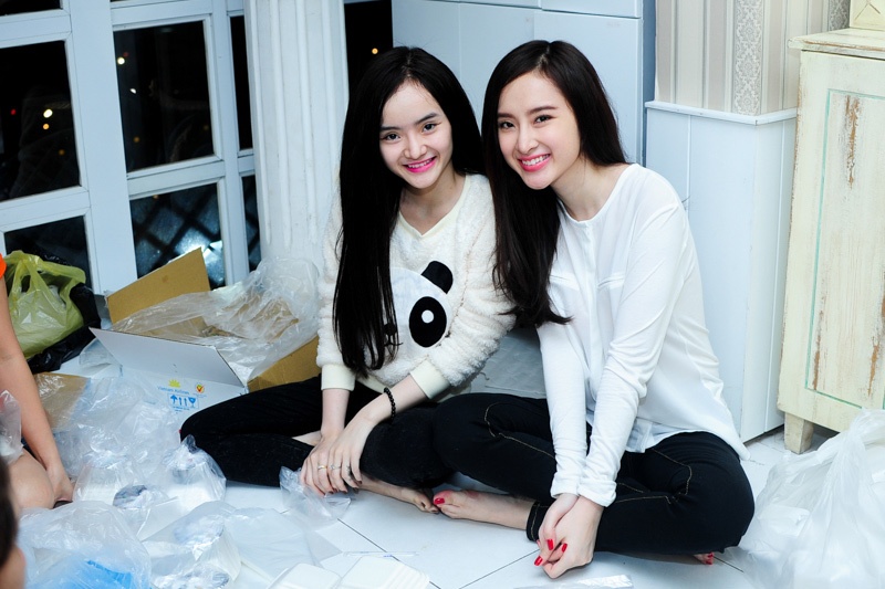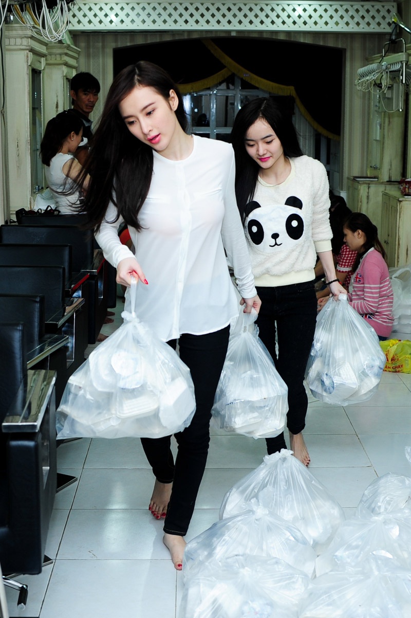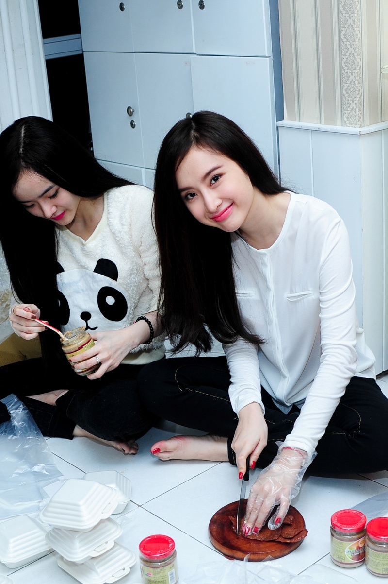 | Tối qua (7/12), Angela Phương Trinh và em gái Phương Trang đã cùng nhau đi phát cơm miễn phí tặng những người nghèo trên đường phố Sài Gòn. Để chuẩn bị cho hơn 100 phần cơm hộp, nữ diễn viên và em gái phải tất bật chuẩn bị những phần cơm này từ tối. Cặp chị em xinh đẹp còn đích thân đi xe máy để phát cơm cho người nghèo. |