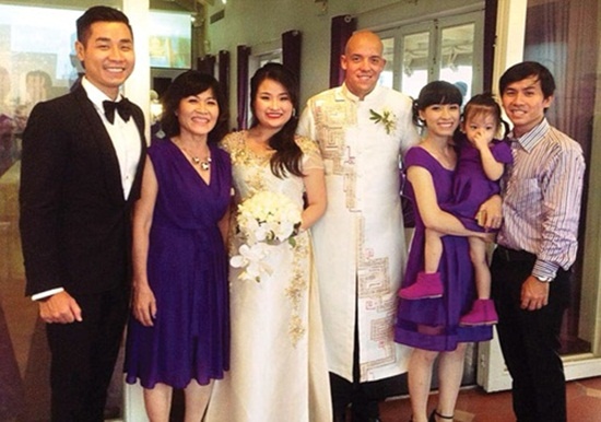 | Nguyên Khang và gia đình rạng rỡ trong đám cưới của cô út Anh Kim. |