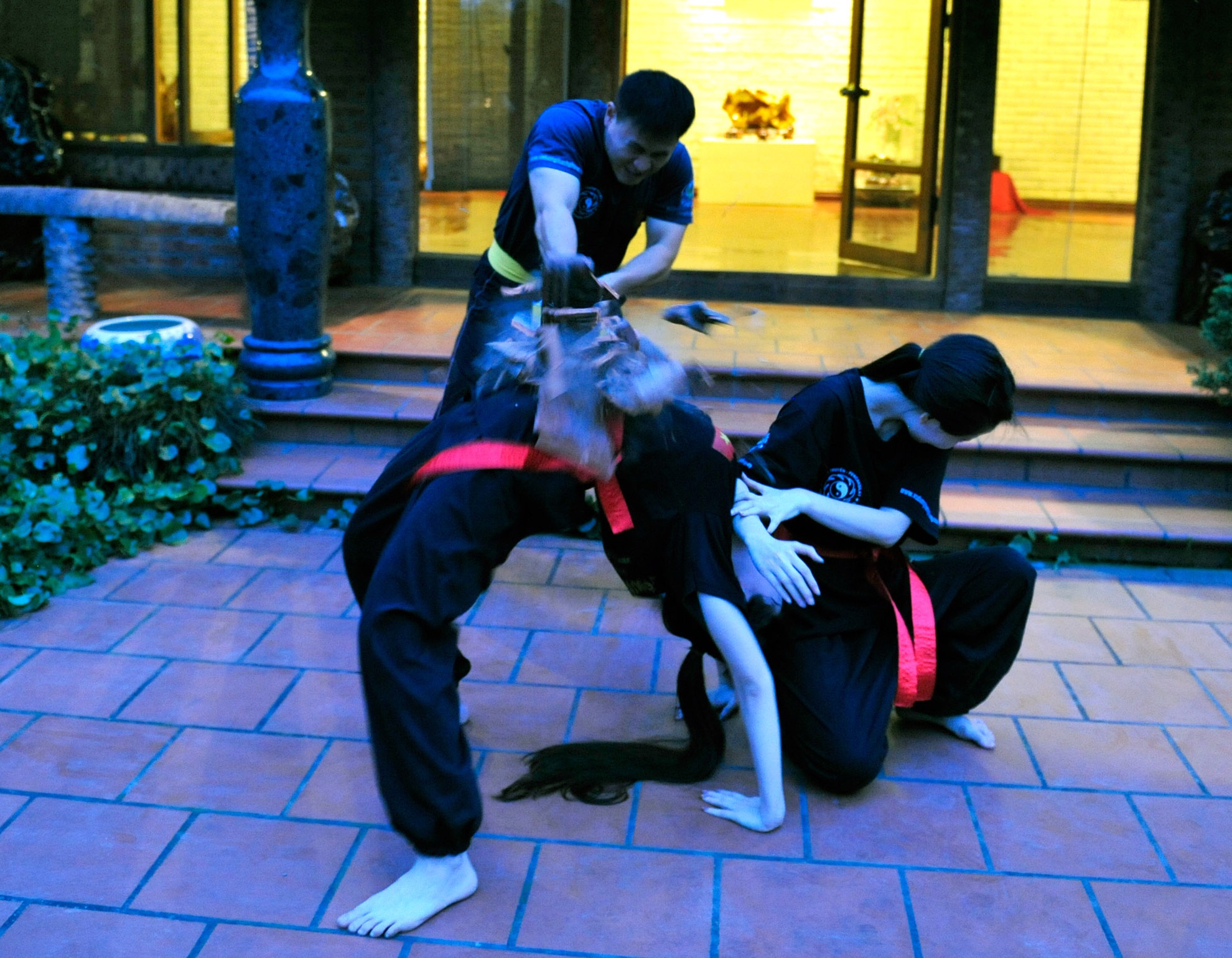 Sau 5 năm tập luyện, cặp chị em song sinh đã có thể tập luyện và biểu diễn nhiều động tác khá độc đáo như chồng ngói lên bụng để búa tạ đập, uốn cong thanh sắt, thanh đao, nằm trên bàn chông đặt ngói lên bụng chặt, xe máy đèo hai người đi qua tấm ván.
