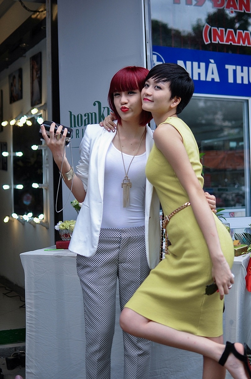 | Hai cô gái của nhóm Bee T vốn là những người em thân thiết của Hoàn Khang ngay từ ngày đầu chập chững vào nghề. Vì vậy, họ đến từ rất sớm tặng hoa và phụ giúp người anh của mình trong việc khai trương. |