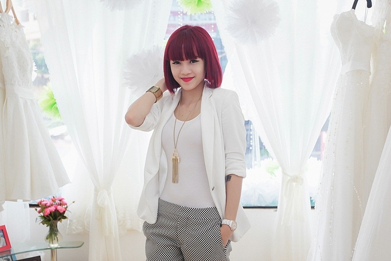 | Bảo Trâm lại cá tính và năng động hơn với quần tây, áo vest. |