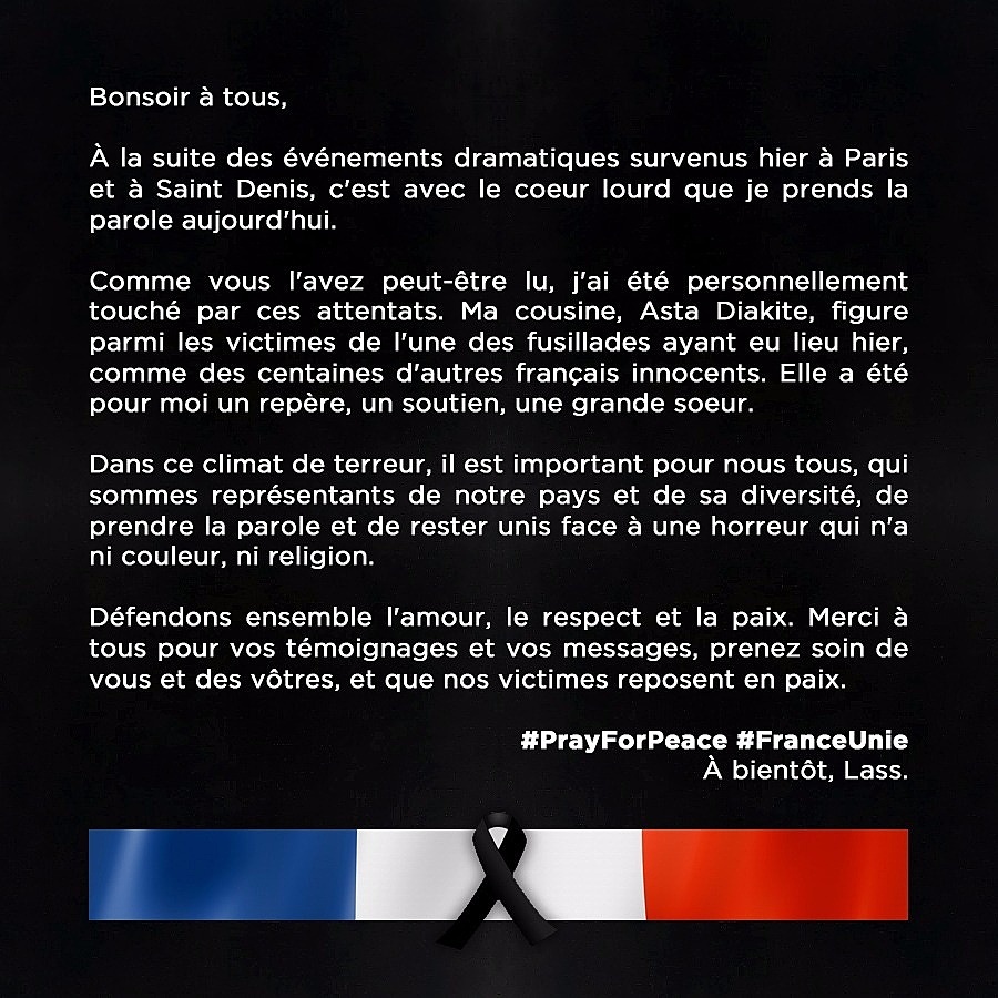 “Có lẽ các bạn đã biết tin người chị họ Asta Diakate của tôi thiệt mạng trong vụ tấn công khủng bố. Chị ấy là người vô tội giống như hơn 100 nạn nhân khác. Đối với tôi, chị ấy là một người chị vĩ đại”.