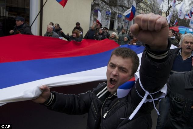 | Những người phản đối chính phủ mới tại Ukraina diễu hành cùng cờ Nga tại thành phố Simferopol hôm 1/3. Ảnh: AP |