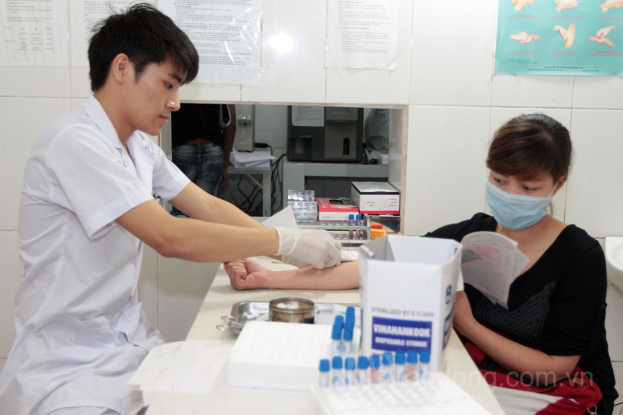 Chị Ngô Thị Hằng lấy máu xét nghiệm khám sức khỏe tại BV Hoài Đức sáng 20/8. |