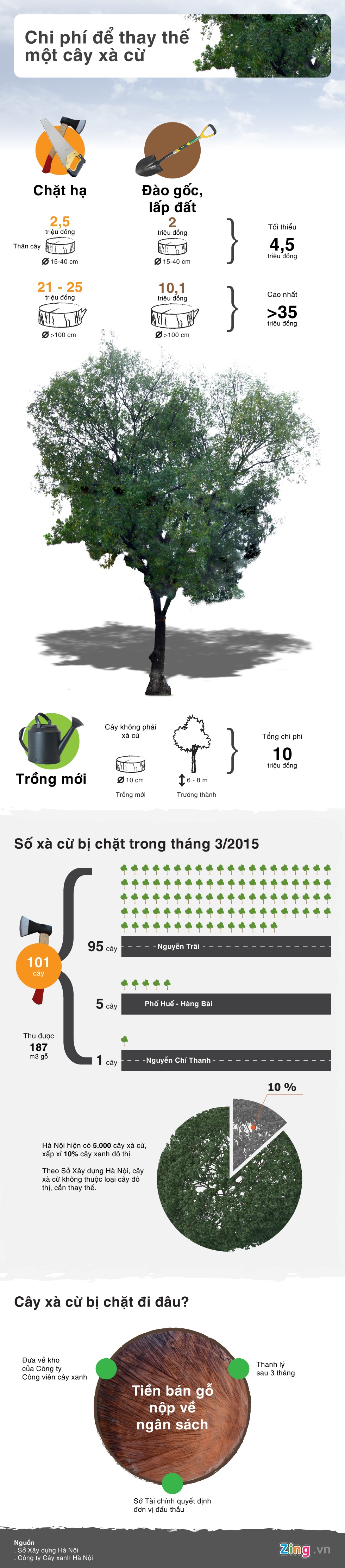Tại Hà Nội, đơn giá của thành phố cho chặt hạ, đào gốc, lấp đất một cây xà cừ là từ 4,5 đến 35 triệu đồng. Còn chi phí trồng cây thay thế là 10 triệu đồng.