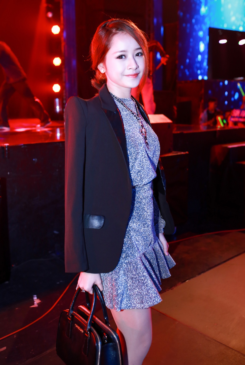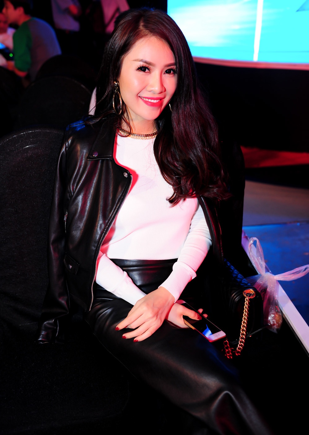 | Tối 25/1, nữ diễn viên Chung cư ma xuất hiện tại sân khấu Hòa âm ánh sáng với gout thời trang thanh lịch, khác hẳn phong cách tomboy trẻ trung như thường thấy. Hot girl Hà thành diện váy ngắn, kết hợp với áo khoác ngoài. Cô mang túi xách cùng tông ăn ý với trang phục. |