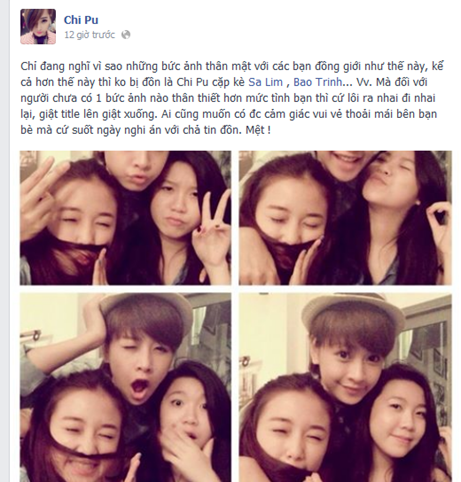 Chi Pu cũng đã lên trang cá nhân của mình chia sẻ bức ảnh thân thiết cùng những người bạn khác, kèm theo đoạn ghi chú: "Chi đang nghĩ vì sao những bức ảnh thân mật với các bạn đồng giới như thế này, kể cả hơn thế này thì không bị đồn là Chi Pu cặp kè Sa Lim, Bảo Trinh... Mà đối với người chưa có 1 bức ảnh nào thân thiết hơn mức tình bạn thì cứ lôi ra nhai đi nhai lại, giật title lên giật xuống. Ai cũng muốn có được cảm giác vui vẻ thoải mái bên bạn bè mà cứ suốt ngày nghi án với chả tin đồn".