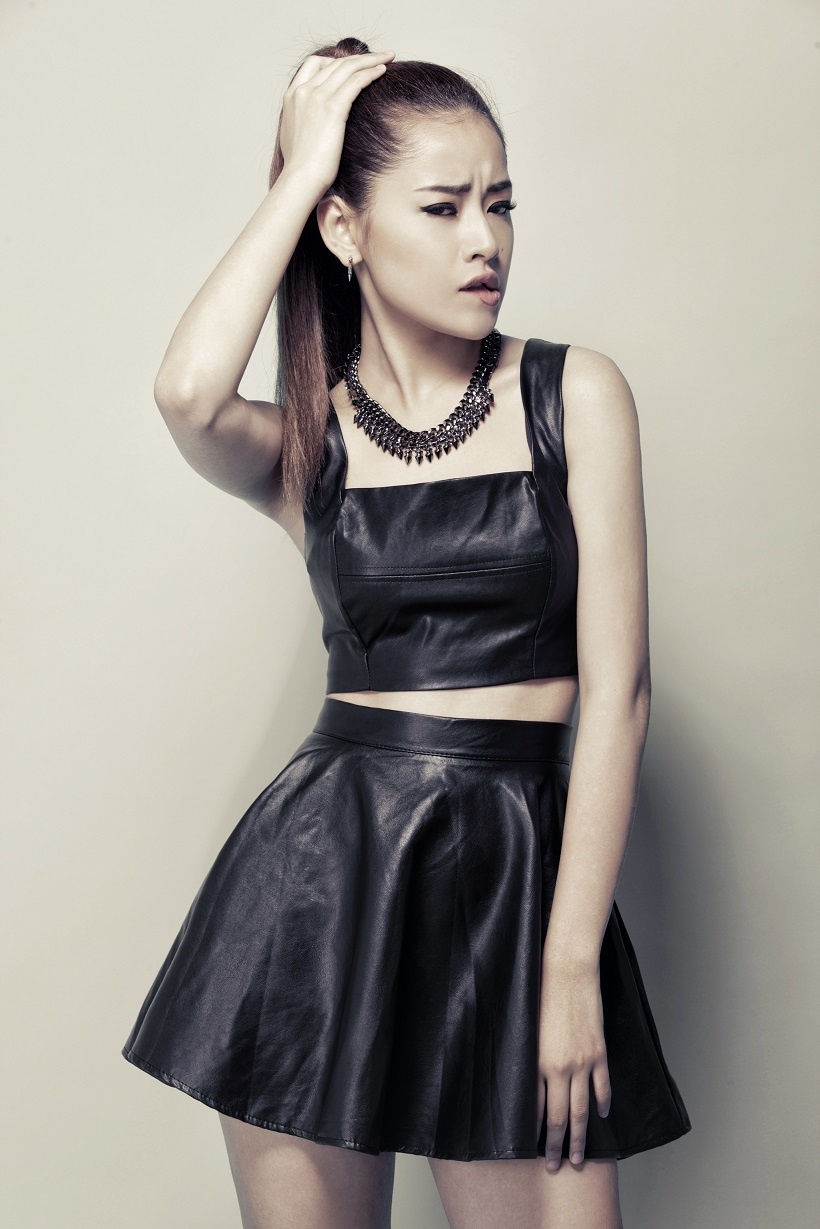 Xuyên suốt bộ ảnh là chất liệu da cá tính, áo croptop, chân váy ngắn hiện đại và năng động.