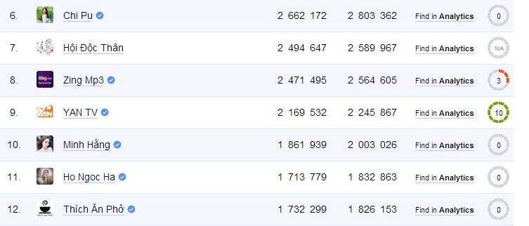 | Bảng đánh giá thứ hạng dựa theo tổng số lượng người hâm mộ trên trang. |