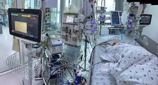 Diễn tiến sau đó đặc biệt nguy kịch khi nhịp tim trẻ tăng lên 210–220 lần/phút. Siêu âm tim cho thấy chức năng co bóp giảm nặng, phân suất tống máu chỉ còn 28–32%. Ê-kíp hồi sức đã hội chẩn khẩn và quyết định triển khai kỹ thuật oxy hóa máu qua màng ngoài cơ thể (ECMO) để hỗ trợ hô hấp và tuần hoàn, kết hợp lọc máu liên tục.