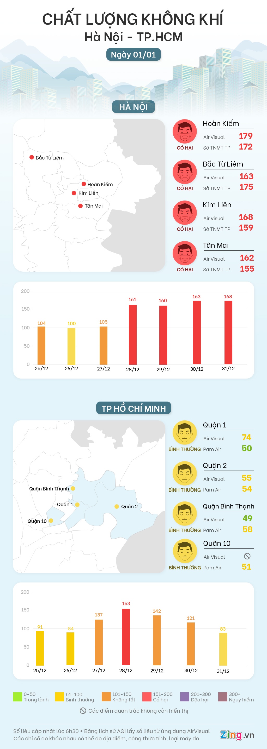 Chỉ số AQI tại các điểm quan trắc ở Hà Nội tiếp tục ở ngưỡng không tốt, hầu hết điểm đo trên 100 đơn vị. Tại TP.HCM, không khí tương đối trong lành sáng cuối năm.