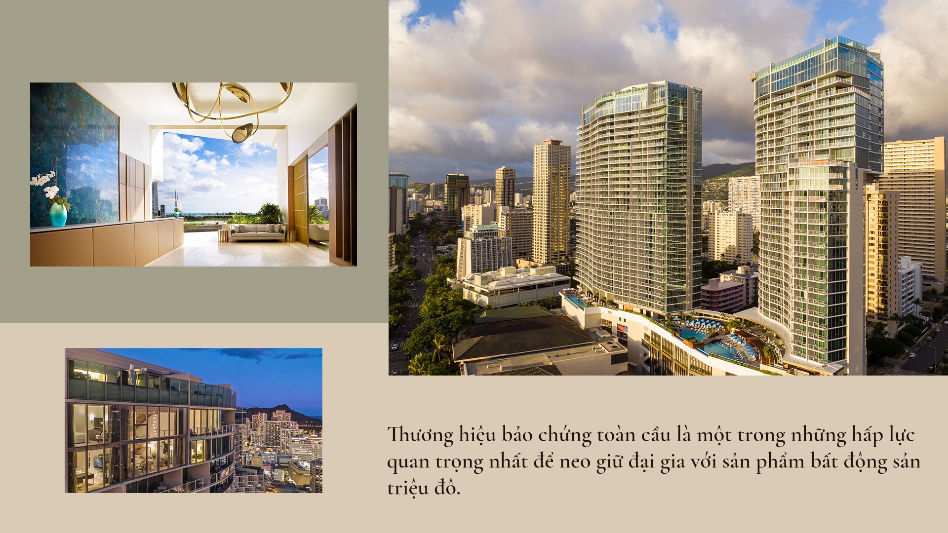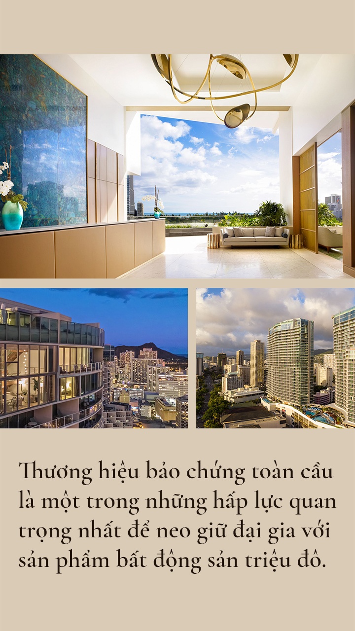 Hai tòa tháp căn hộ nghỉ dưỡng của Ritz-Carlton tại Honolulu Hawaii là dẫn chứng điển hình cho giá trị thương hiệu trên thị trường bất động sản hạng sang. Dù không có lợi thế nằm kế cận những bãi biển hoang dại tại hòn đảo du lịch nổi tiếng, 556 căn hộ nghỉ dưỡng của Ritz-Carlton vẫn nhanh chóng trở thành tài sản thuộc sở hữu các đại gia. Lý do được cho là đến từ niềm tin vào giá trị thương hiệu vững chắc của Marriott - ông lớn ngành khách sạn đang nắm giữ đến 21% dự án siêu sang trên toàn thế giới.