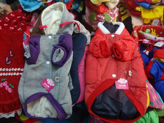 | Quần áo ấm áp, đủ hình dáng và màu sắc dành cho thú cưng có giá từ vài trăm nghìn đồng đến cả triệu đồng. Ảnh: Thúy Hà. |