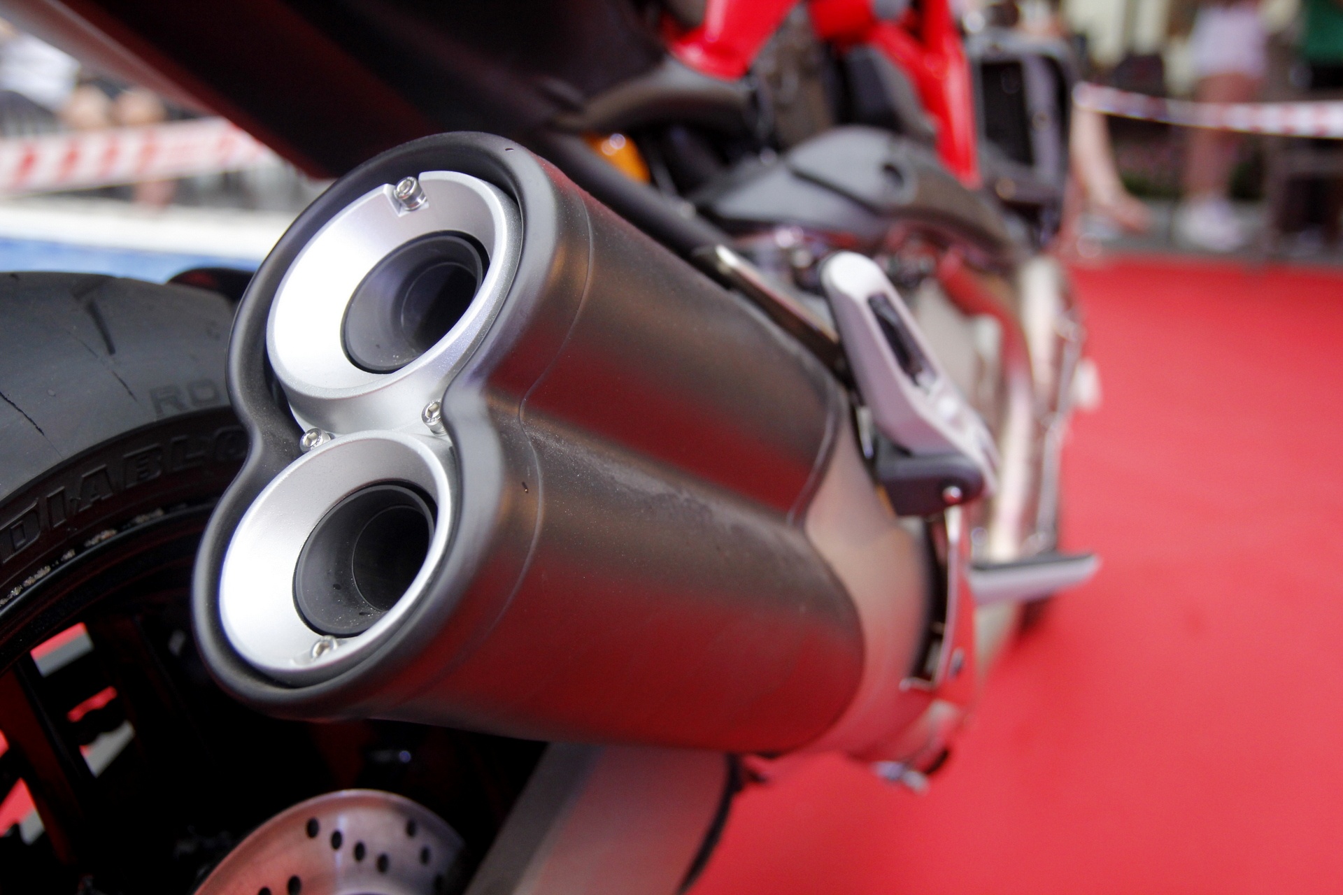 | Ống xả kép được bố trí theo kiểu 2-1-2, nằm một bên khiến chiếc xe gọn gàng hơn. Thép không gỉ và nhôm là hai chất liệu được sử dụng để chế tạo ống pô này. |