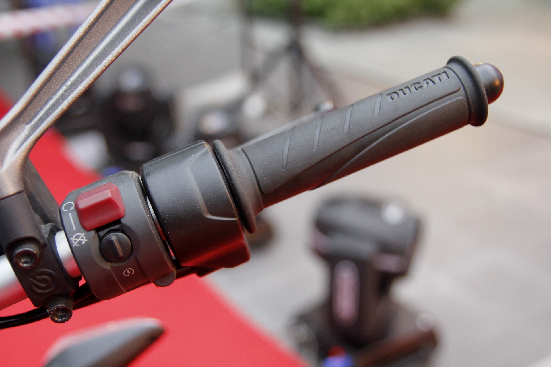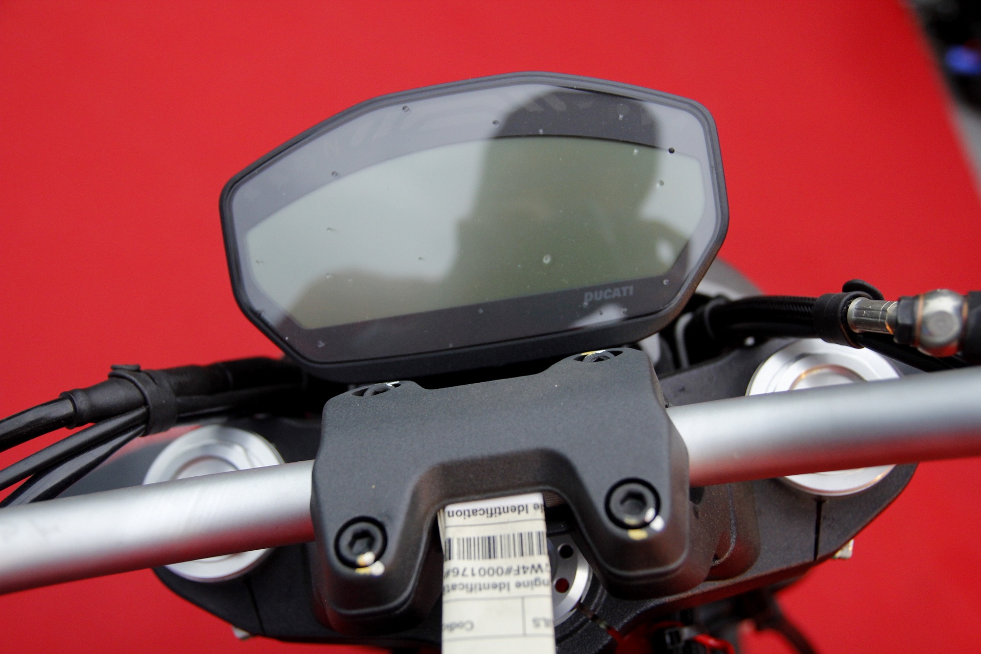 | Nhìn từ phía trước, tay lái Monster 821 được thiết kế lại, gần yên 40 mm và cao hơn 40 mm so với Monster 796. |