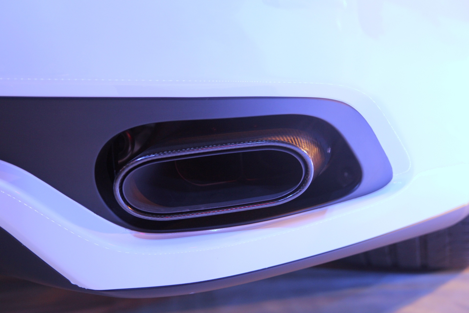 | Ống xả hình bầu dục được sơn đen bên trong, bên ngoài bọc sợi carbon. |