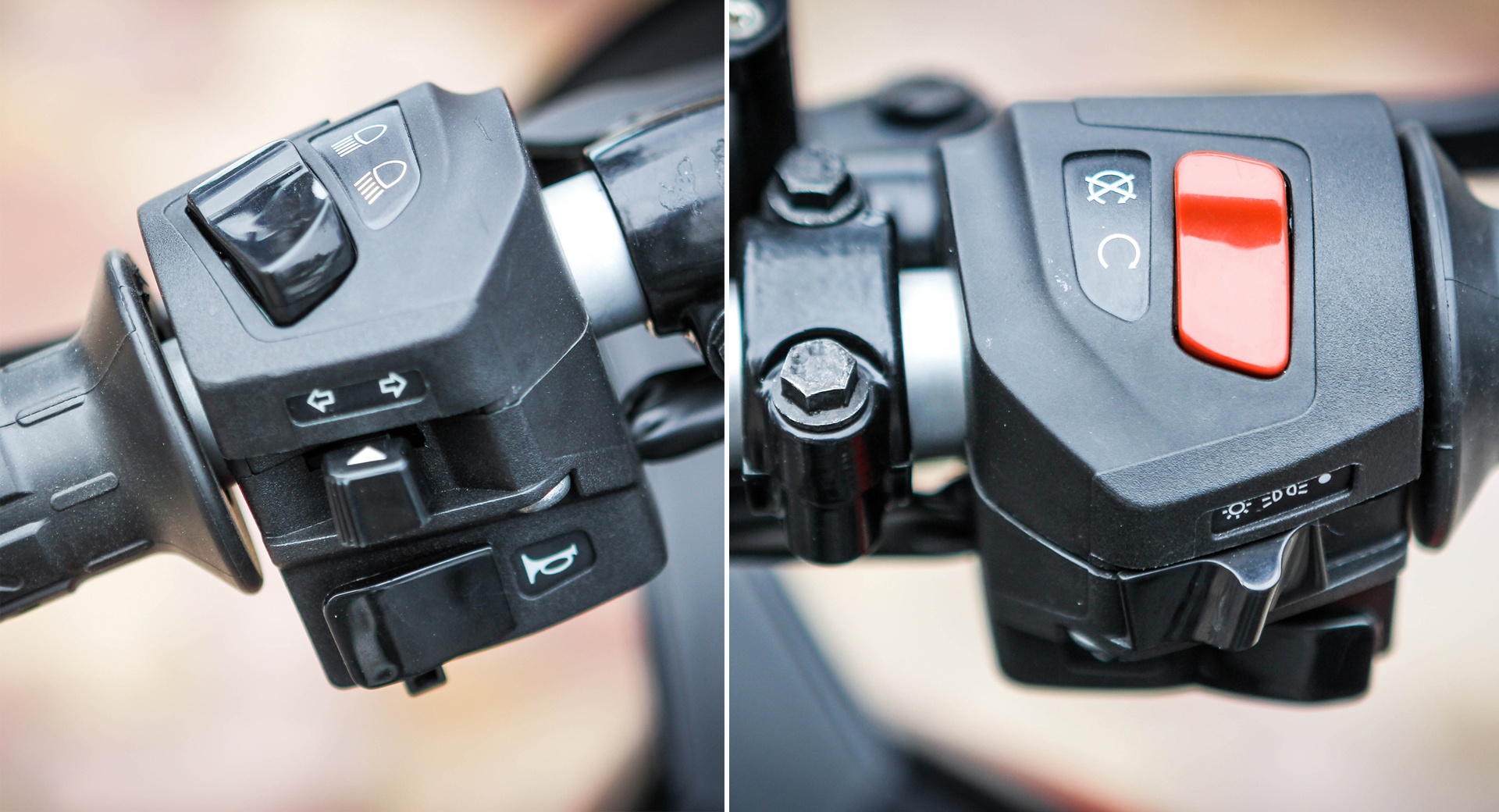 | Cụm nút bấm điều khiển trên Pulsar RS200 có công tắc tắt mở đèn pha, khác với nhiều mẫu môtô nhập khẩu về Việt Nam trước đây. |