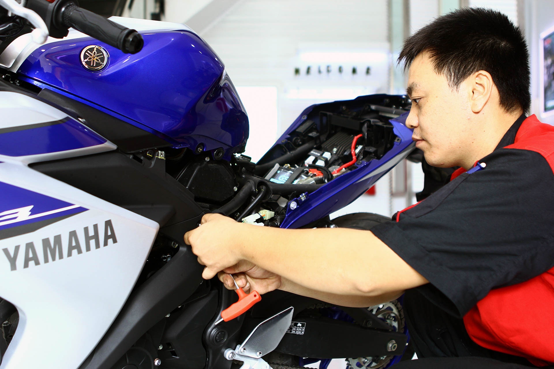 Công đoạn này kéo dài khoảng 20 phút. Theo kỹ thuật viên của Yamaha, đây là chiếc R3 đầu tiên được tháo dàn vỏ tại Việt Nam, nên việc thao tác mất hơi nhiều thời gian.
