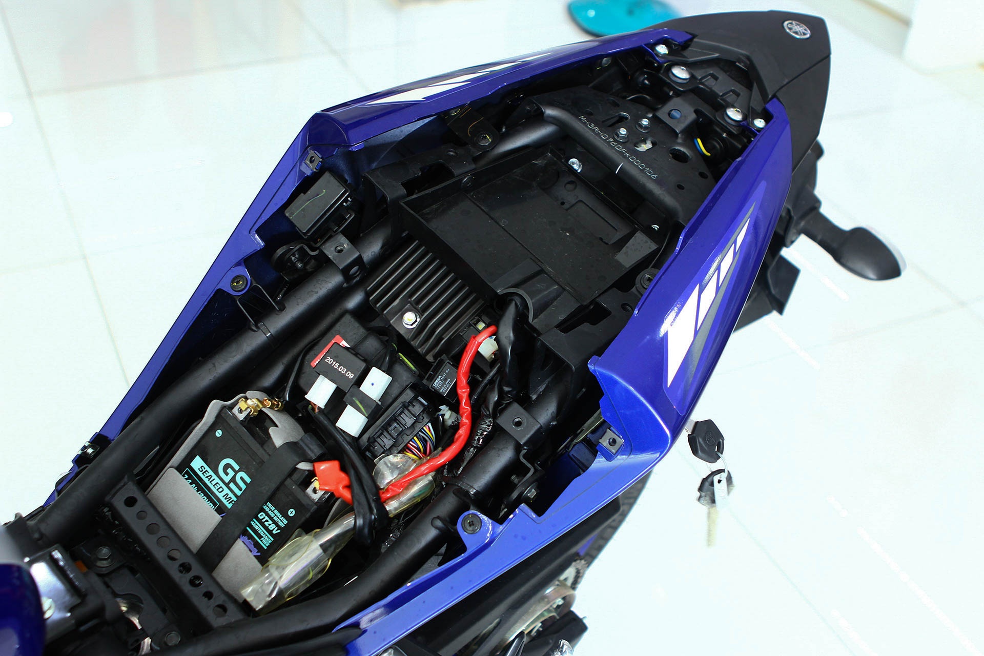 | Sau khi tháo yên xe, toàn bộ hệ thống điện bên dưới đã lộ diện, với bình ắc quy, ECU, dây dẫn... |