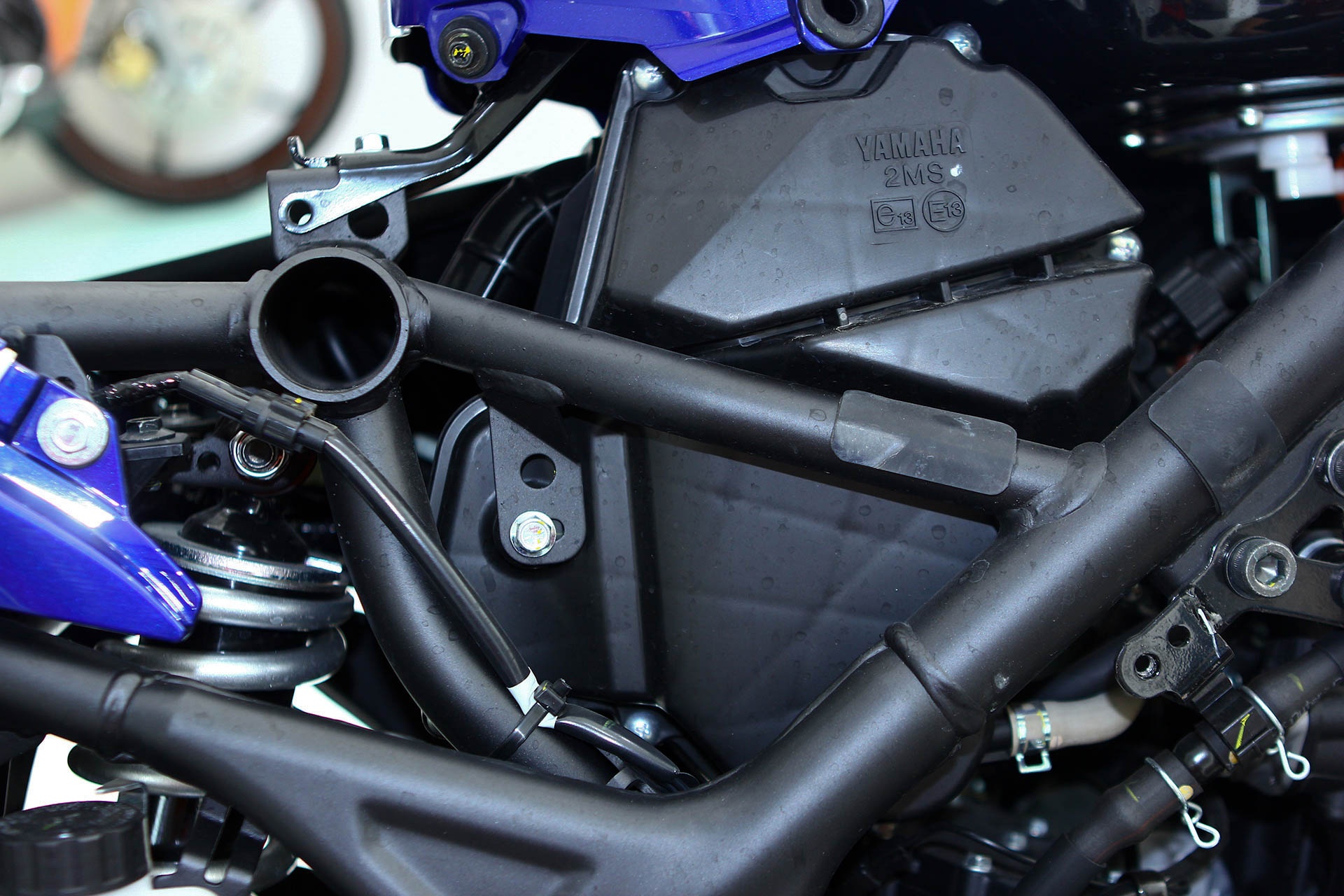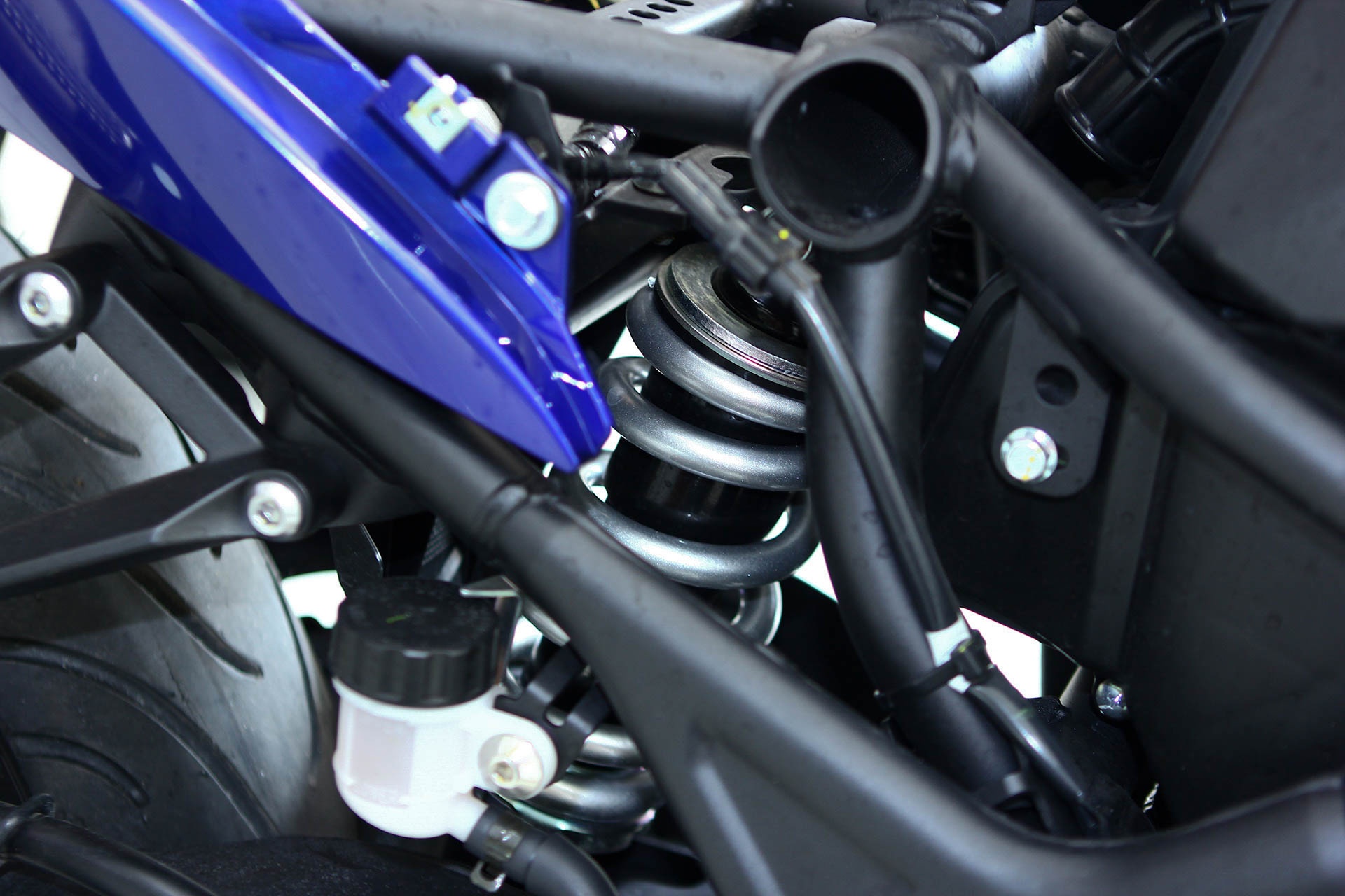 Khi tháo toàn bộ dàn vỏ, giảm xóc monoshock phía sau có thể thấy rõ. YZF-R3 mới được Yamaha Việt Nam giới thiệu hôm 18/9 kèm giá bán 150 triệu đồng.
