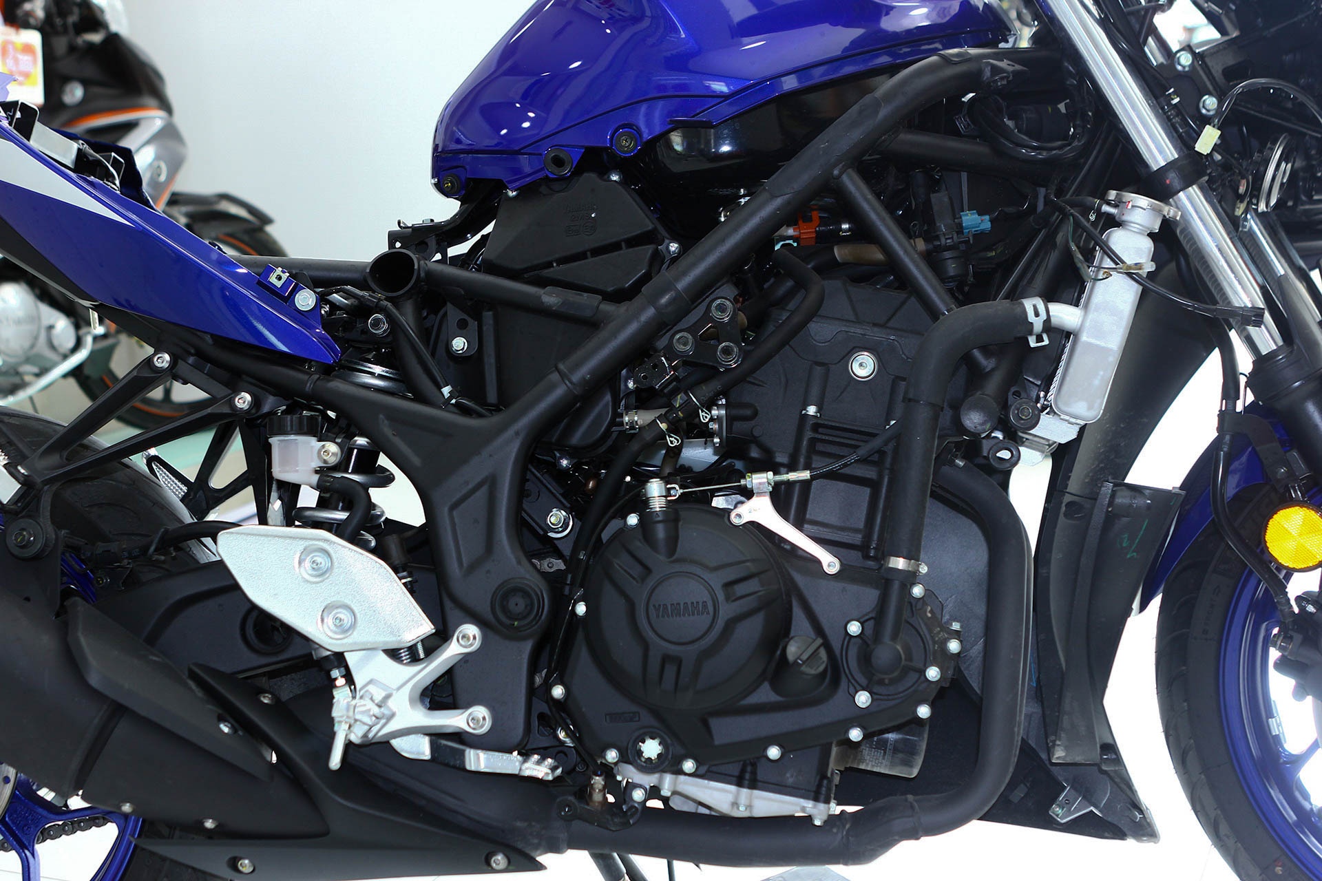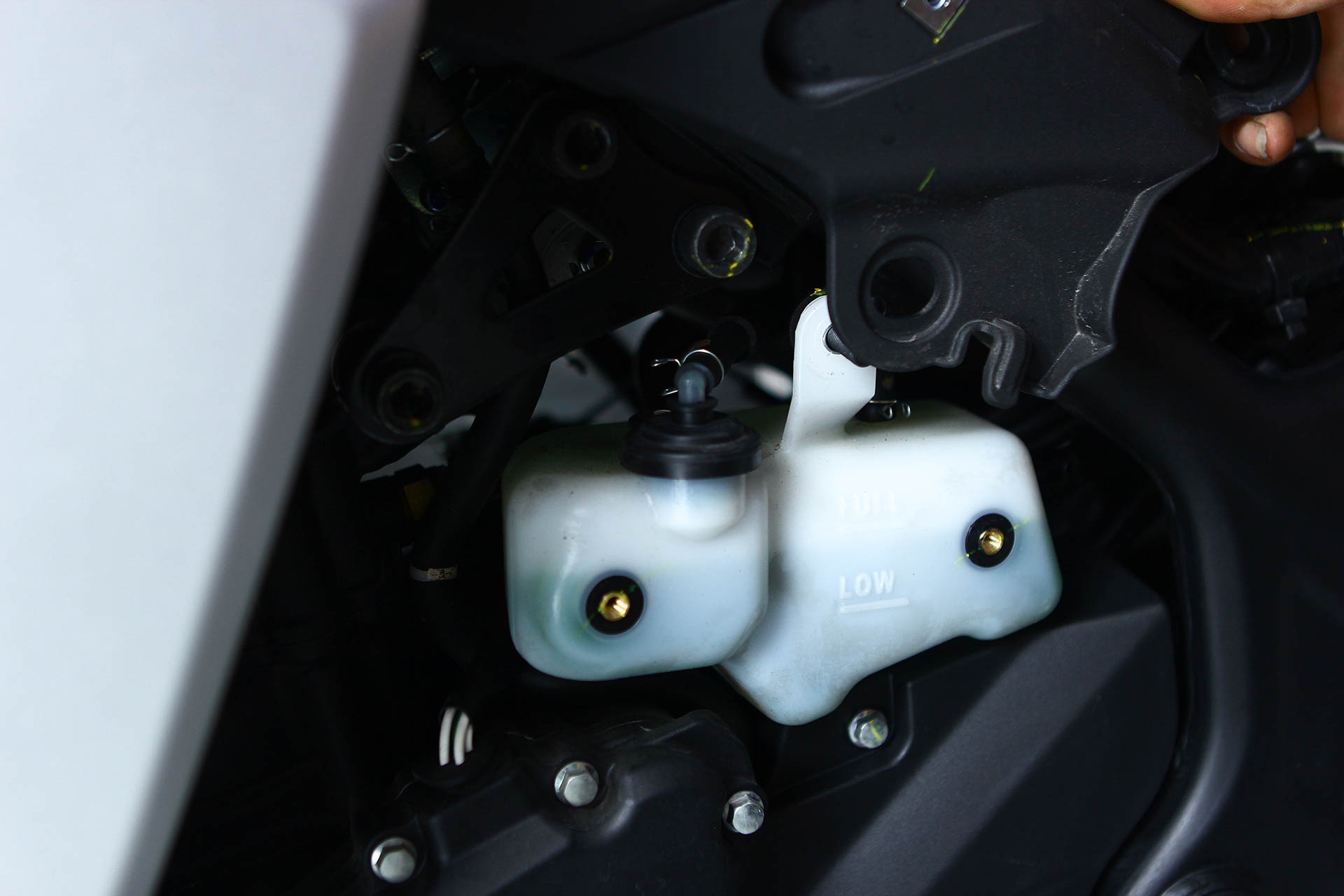 | Két nước làm mát phụ được đặt bên trái hệ khung sườn. Mức nước nằm giữa khoảng Full và Low in trên bình là hợp lý đối với YZF-R3 nói riêng cũng như nhiều mẫu xe khác. |
