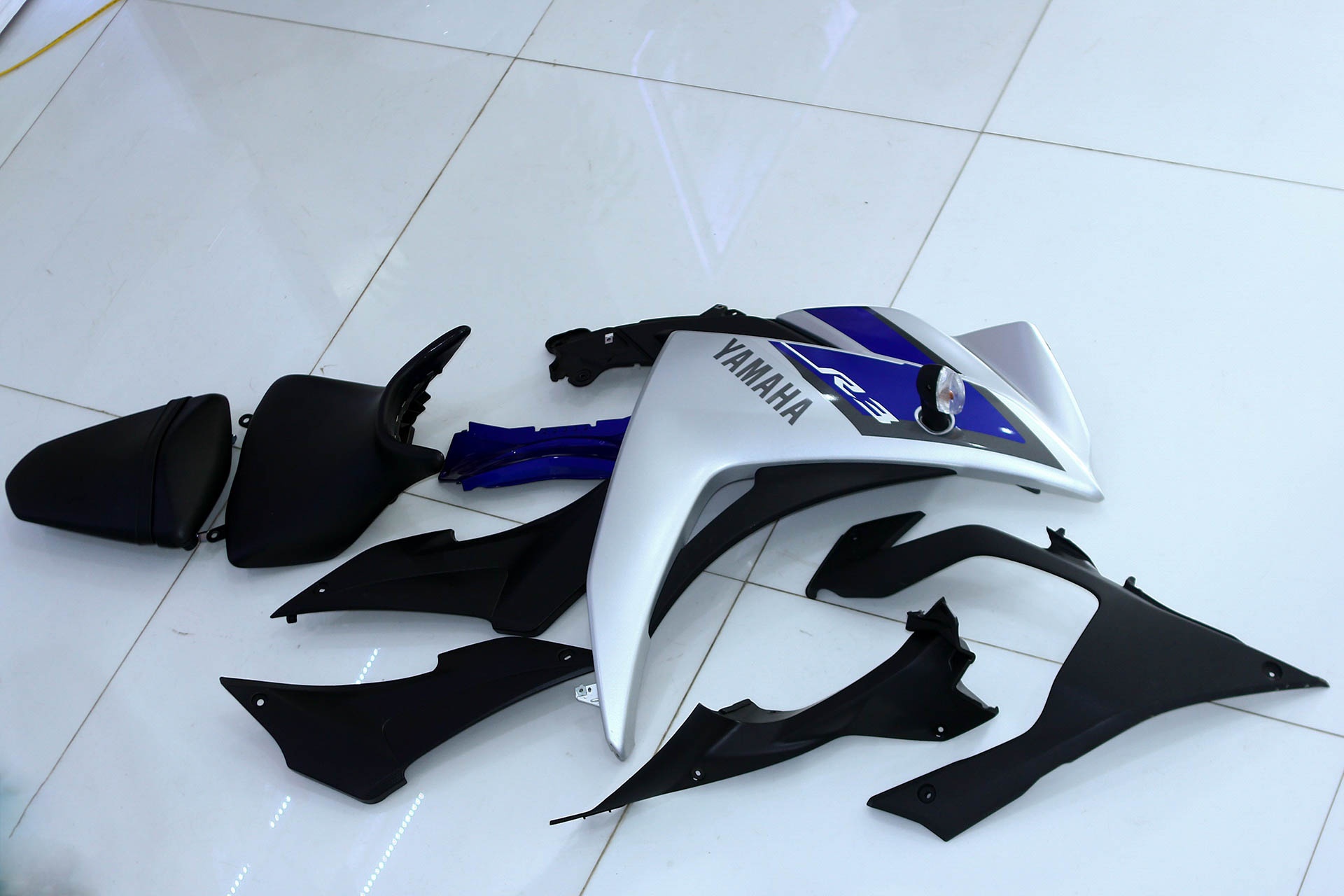 Dàn vỏ và yên xe sau khi tháo rời. Vỏ của YZF-R3 làm bằng nhựa và có độ dẻo vừa phải. Thiết kế hợp lý và sử dụng các vật liệu nhẹ giúp trọng lượng ướt của xe chỉ ở mức 166 kg. Người dùng có thể dễ dàng dắt xe cũng như vận hành thoải mái hơn.
