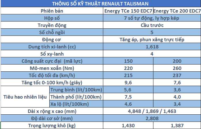 | Talisman được trang bị cả động cơ xăng và diesel, tuy nhiên phiên bản nhập về Việt Nam chỉ sử dụng động cơ xăng 1,6 lít tăng áp, sản sinh từ 150 đến 200 mã lực. |