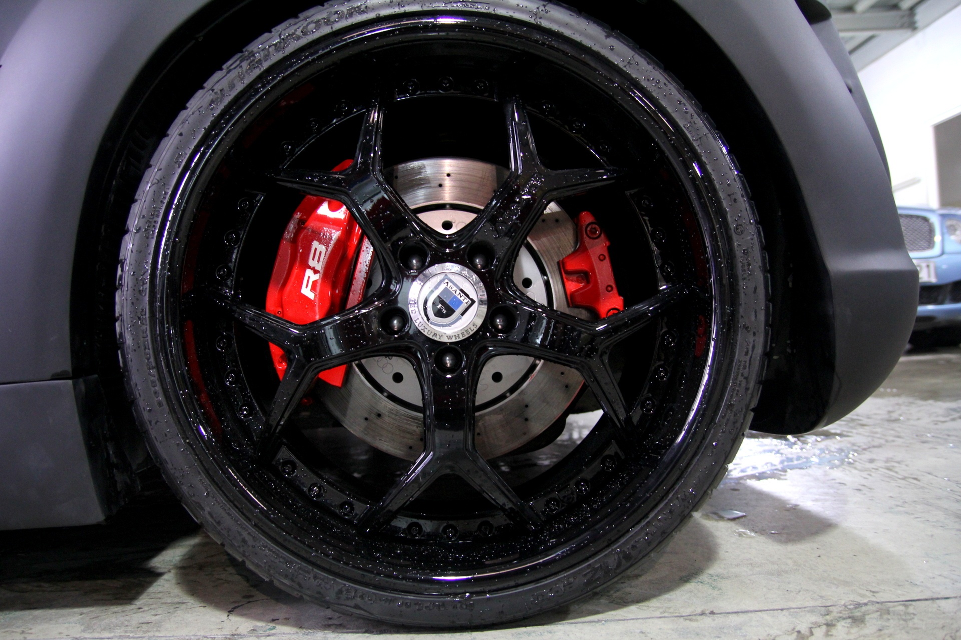 | Bộ vành 20 inch hiệu Asanti được sơn đen bóng. Bên trong là kẹp phanh màu đỏ hiệu suất cao của Audi R8. |