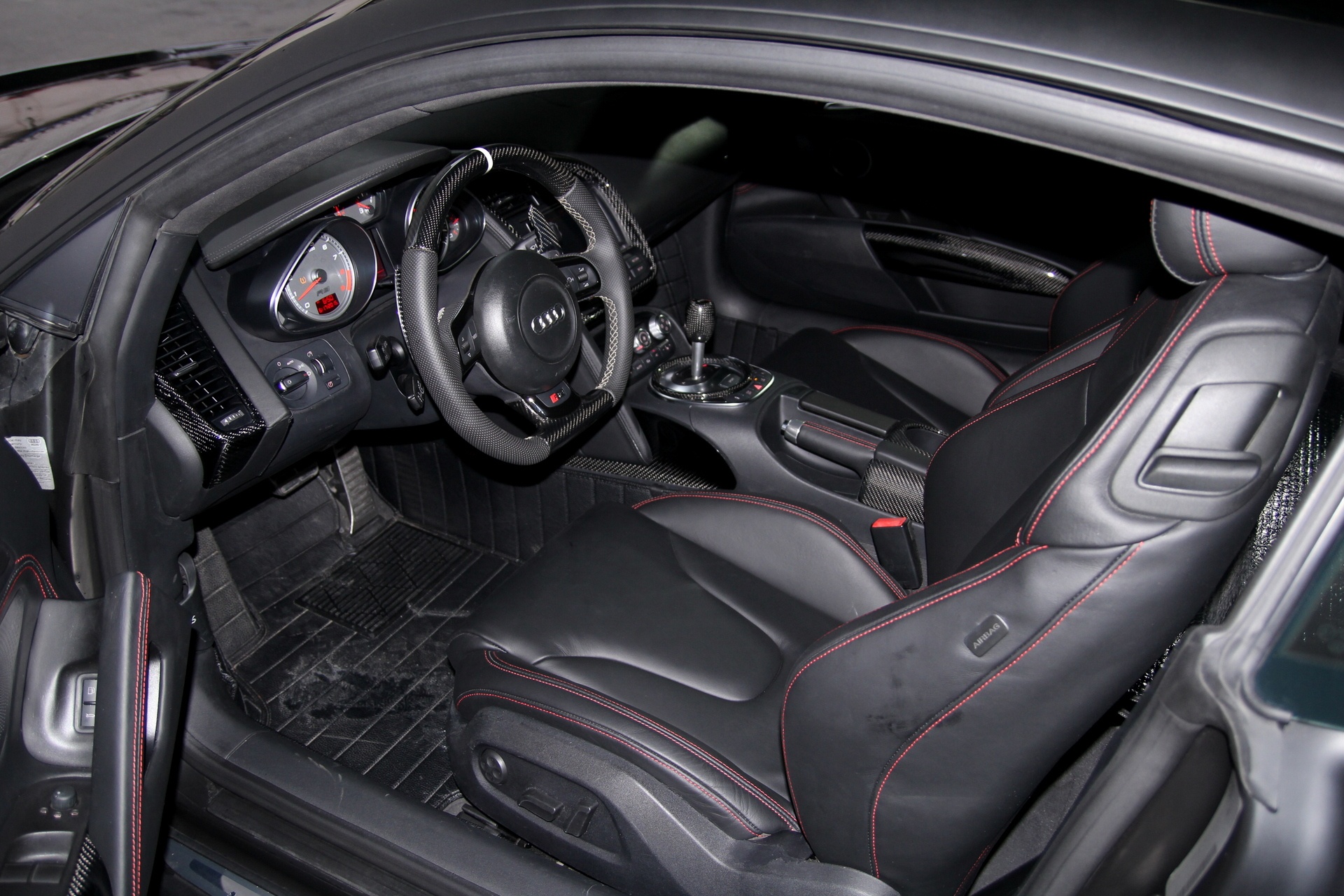 | Nội thất cũng được bọc lại da hoàn toàn và nhiều chi tiết ốp sợi carbon. Các đường chỉ khâu đỏ tương phản với da đen. Mặc dù là xe thể thao nhưng Audi R8 vẫn chú ý tới sự thoải mái của người sử dụng, vì vậy nệm ghế khá dầy và êm. |