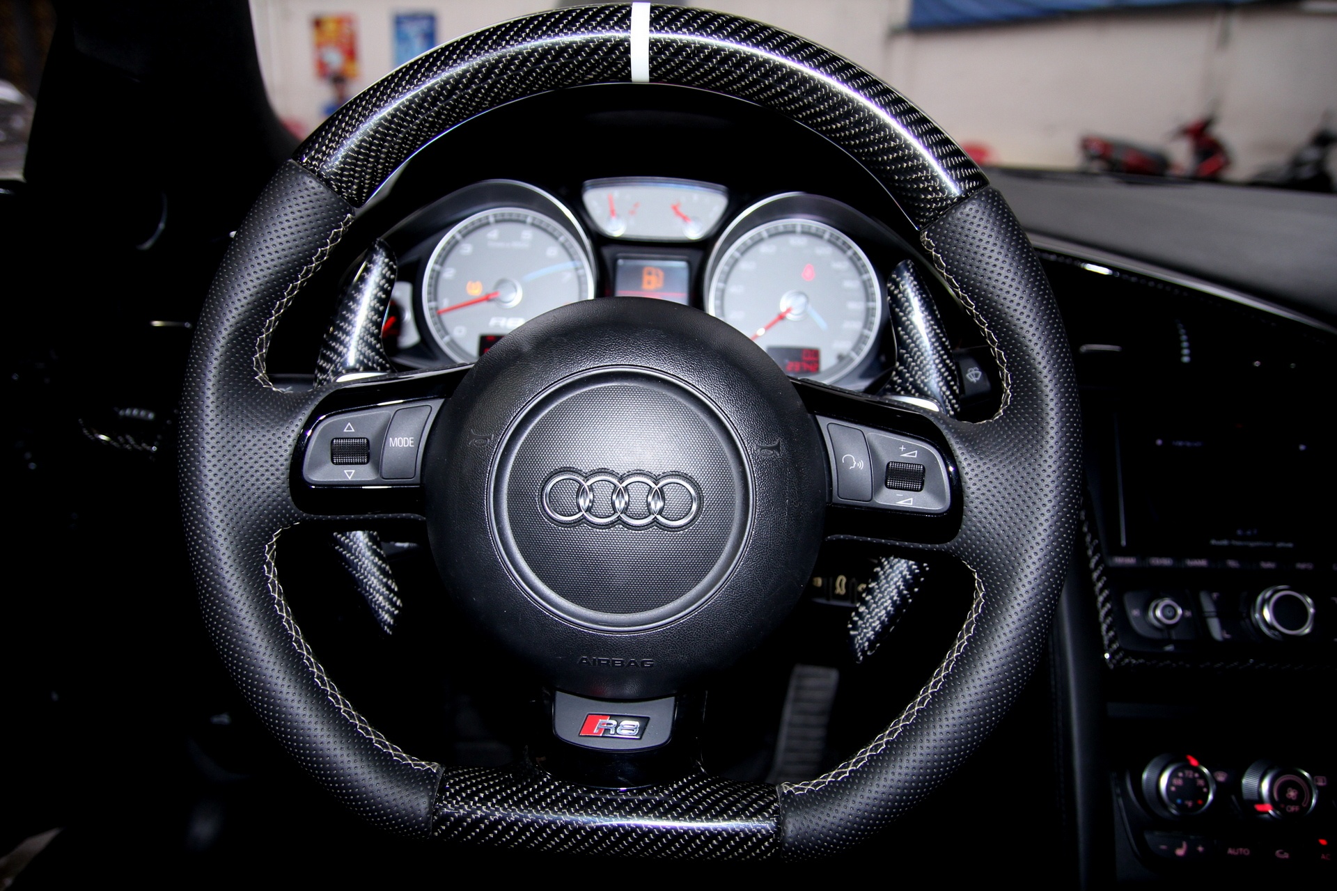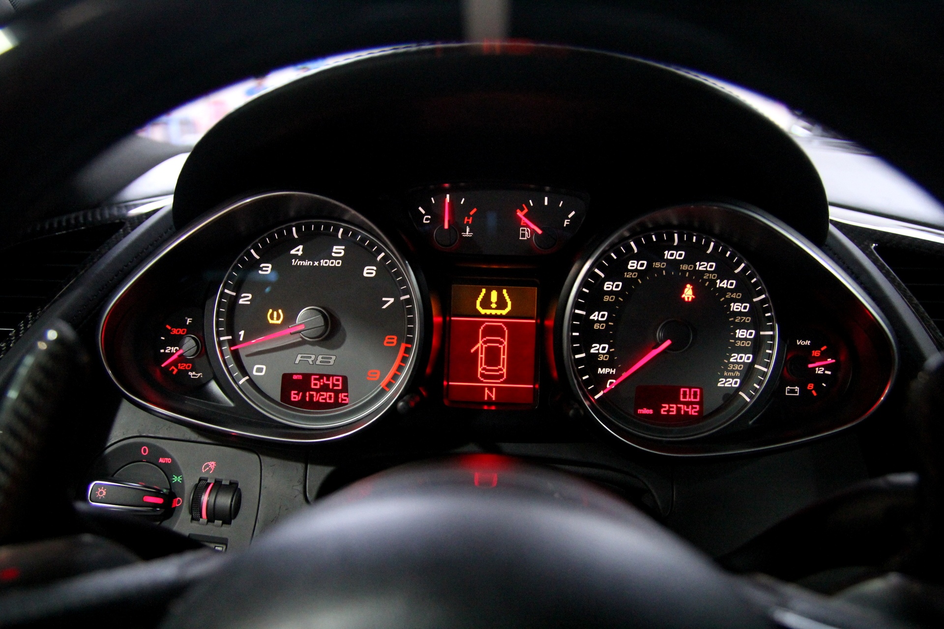| Bảng đồng hồ trung tâm trên R8 kết hợp giữa analog và màn hình LCD, hiển thị rõ ràng, đẩy đủ các thông số hành trình nhưng không khiến người lái mất tập trung. |