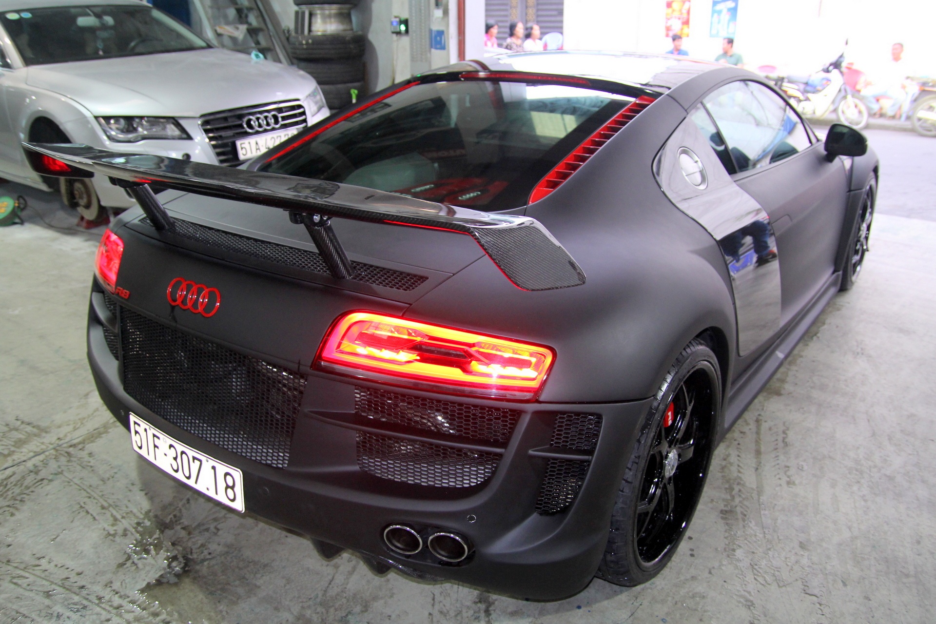 | Cụm đèn hậu chiếu sáng bằng LED nổi bật. Đây là một trong những chiếc R8 độ mạnh tay nhất tại TP HCM hiện nay. Ngoài ra, ở Sài Gòn còn một chiếc R8 độ Prior Design mạnh 620 mã lực. |