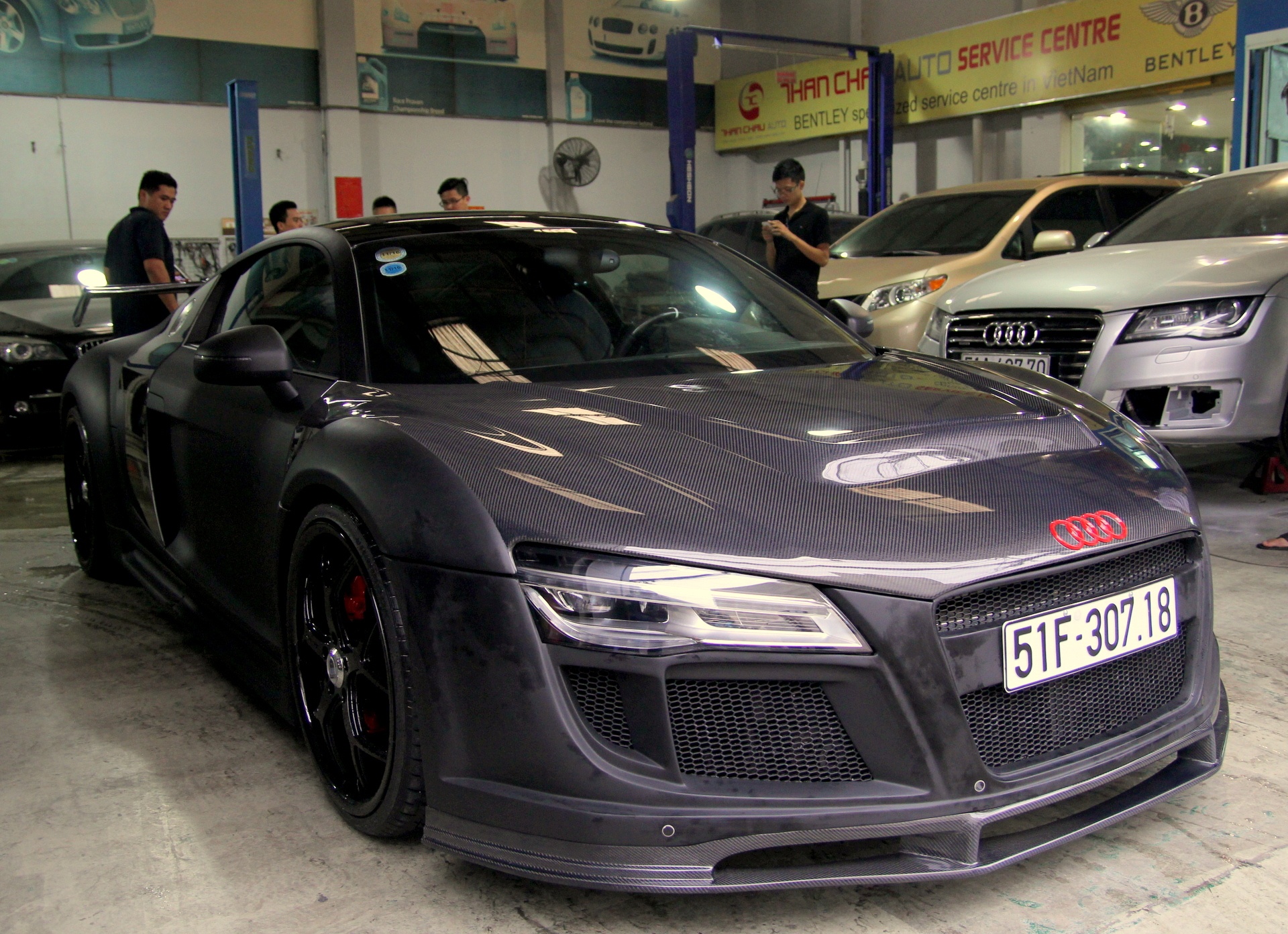 | Đây là chiếc Audi R8 độ gói bodykit của hãng PPI Design, cùng nhiều phụ kiện hàng hiệu đắt tiền vừa xuất xưởng ở Sài Gòn. PPI Design là hãng độ xe nổi tiếng của Đức chuyên thiết kế những mẫu hầm hố. |