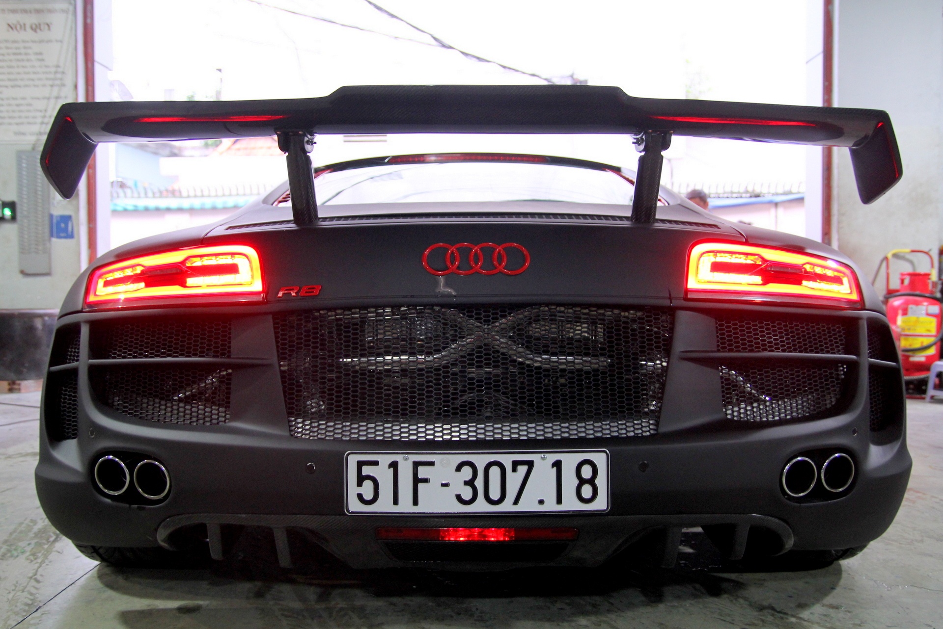 | Siêu xe R8 xuất hiện trên đường phố gây chú ý không chỉ bởi ngoại hình hầm đố, độc nhất mà còn bởi âm thanh khủng khiếp phát ra từ bốn họng pô. |
