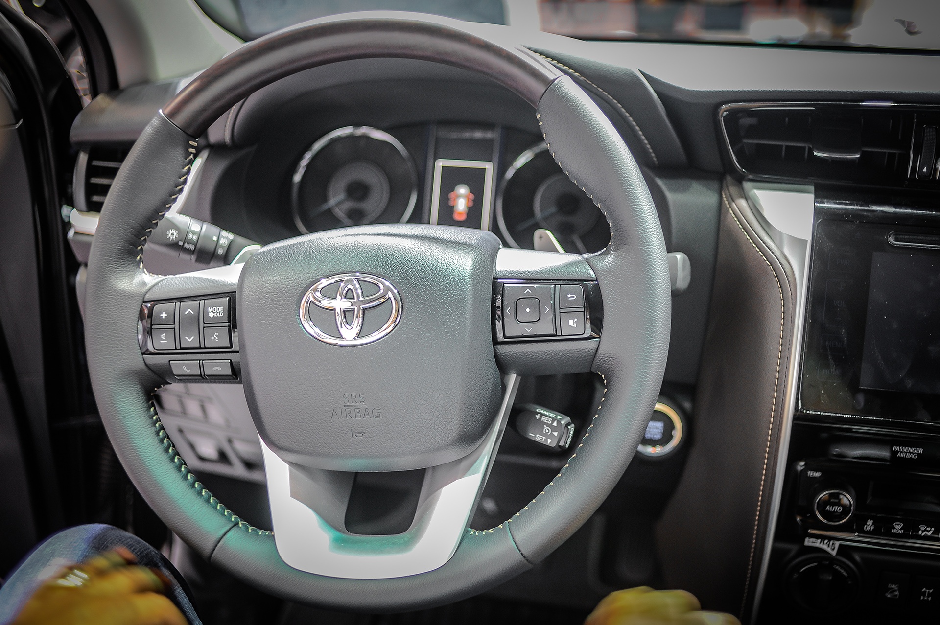 | Vô lăng thiết kế mới, bọc da, ốp gỗ tích hợp nhiều nút bấm chức năng, khá giống phong cách thiết kế của Innova thế hệ mới. Vô lăng của Fortuner 2017 tích hợp lẫy chuyển số, cài đặt kiểm soát hành trình. Mẫu SUV này còn hỗ trợ ra lệnh bằng giọng nói. |