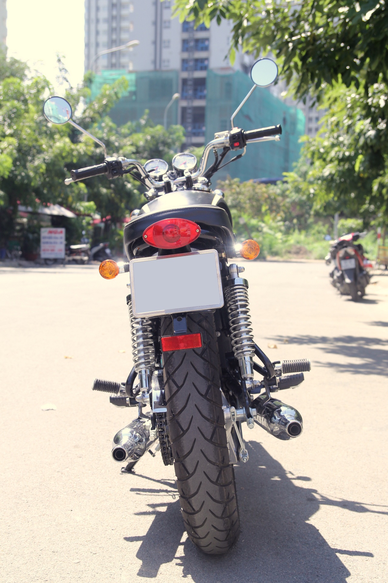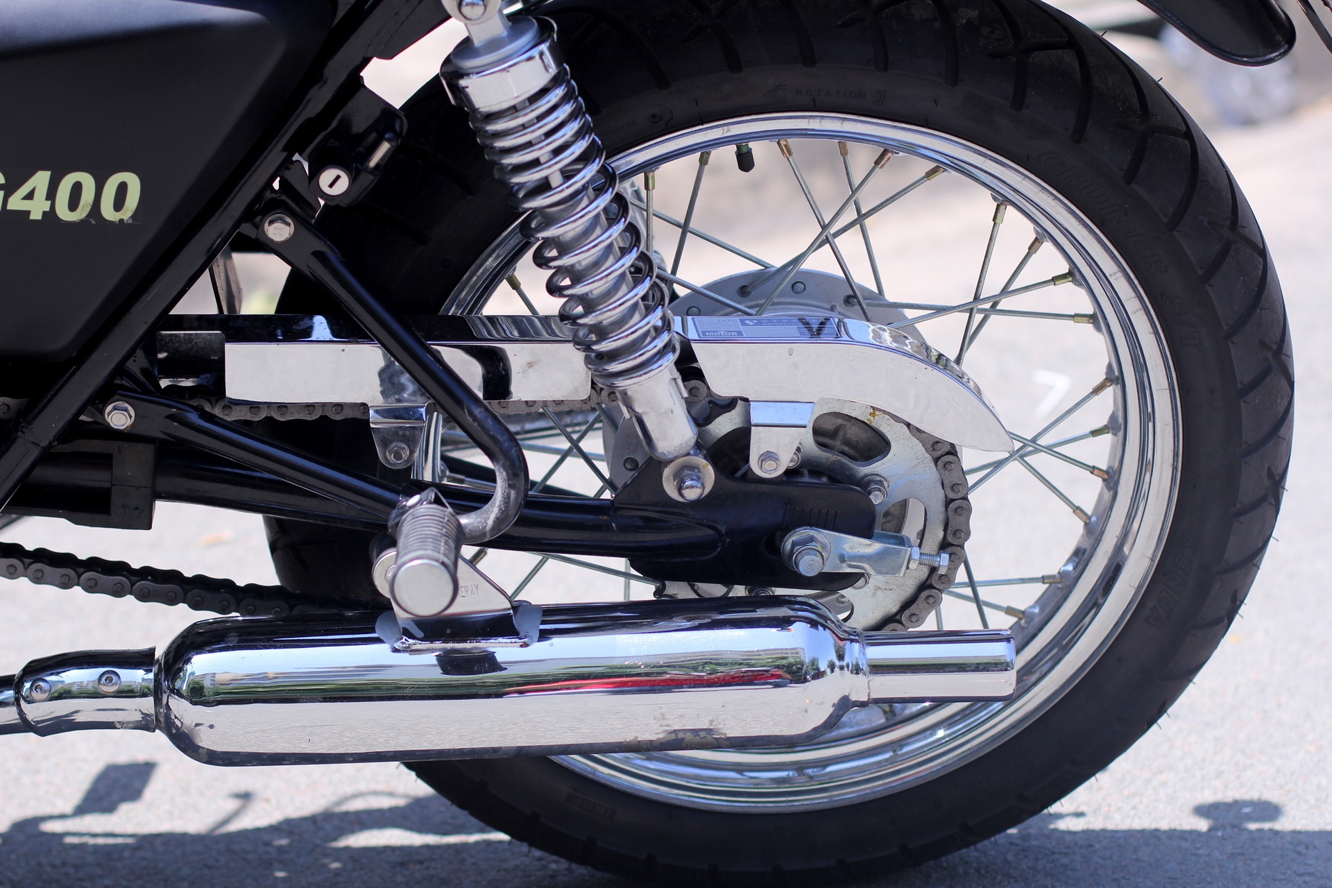 Hai ống xả có hình dáng tương tự trên những chiếc Triumph Bonneville. Vành căm mạ chrome sáng bóng.