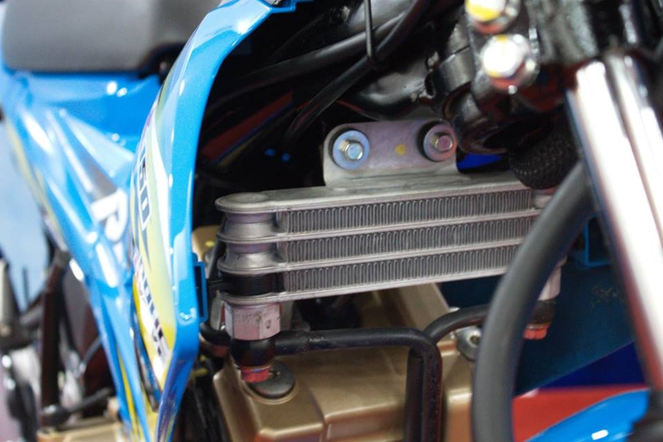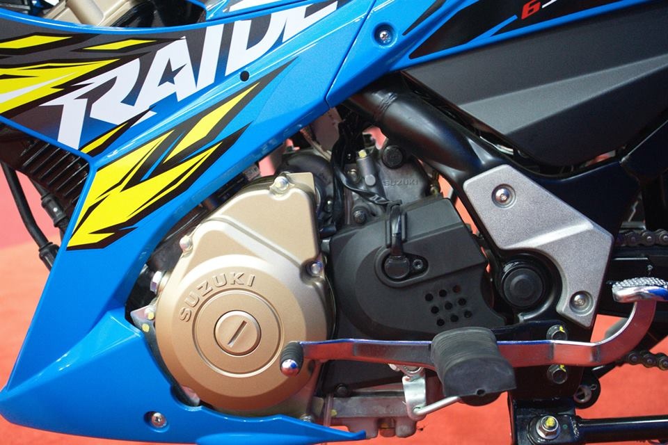 | Suzuki Raider R150 được trang bị động cơ 150 phân khối, 4 van DOHC làm mát bằng dầu, sản sinh công suất tối đa 16 mã lực tại 9.500 vòng/phút. Hộp số côn tay 6 số. |